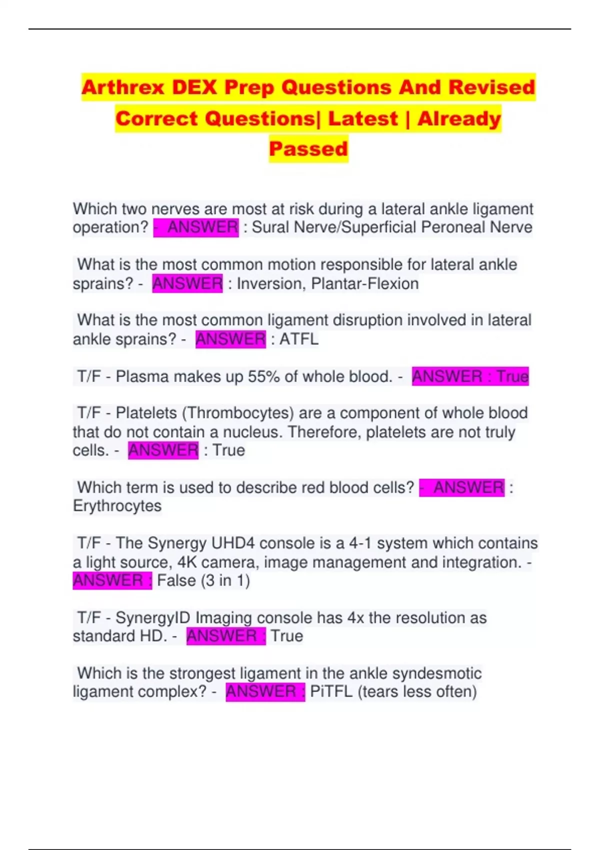 Arthrex DEX Prep Questions And Revised Correct Questions| Latest | Already Passed Which two nerves are most at risk during a lateral ankle ligament operation? - ANSWER : Sural Nerve/Superficial Peroneal Nerve What is the most common motion responsible for lateral ankle sprains? - ANSWER : Inversion, Plantar-Flexion What is the most common ligament disruption involved in lateral ankle sprains? - ANSWER : ATFL T/F - Plasma makes up 55% of whole blood. - ANSWER : True T/F - Platelets (Thrombocytes) are a component of whole blood that do not contain a nucleus. Therefore, platelets are not truly cells. - ANSWER : True Which term is used to describe red blood cells? - ANSWER : Erythrocytes T/F - The Synergy UHD4 console is a 4-1 system which contains a light source, 4K camera, image management and integration. - ANSWER : False (3 in 1) T/F - SynergyID Imaging console has 4x the resolution as standard HD. - ANSWER : True Which is the strongest ligament in the ankle syndesmotic ligament complex? - ANSWER : PiTFL (tears less often)