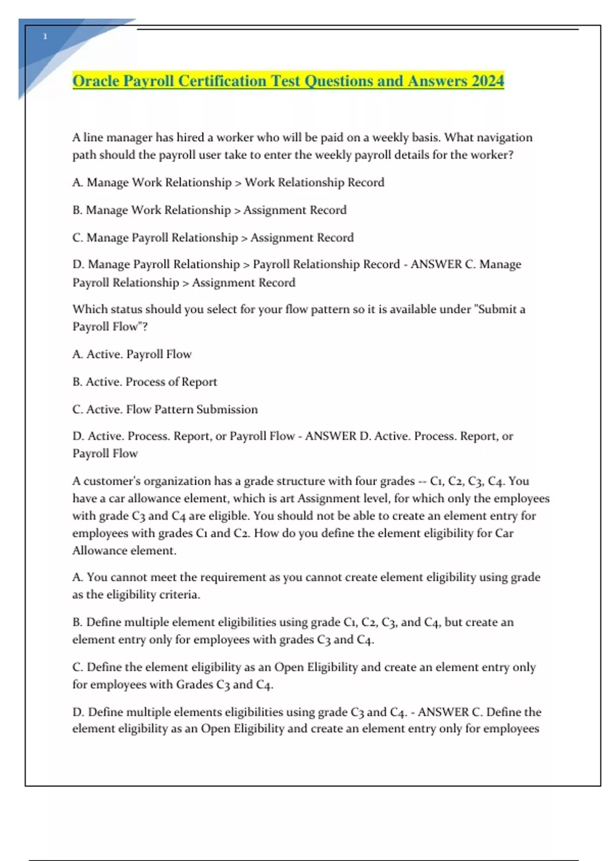 Oracle Payroll Certification Test Questions and Answers 2024.