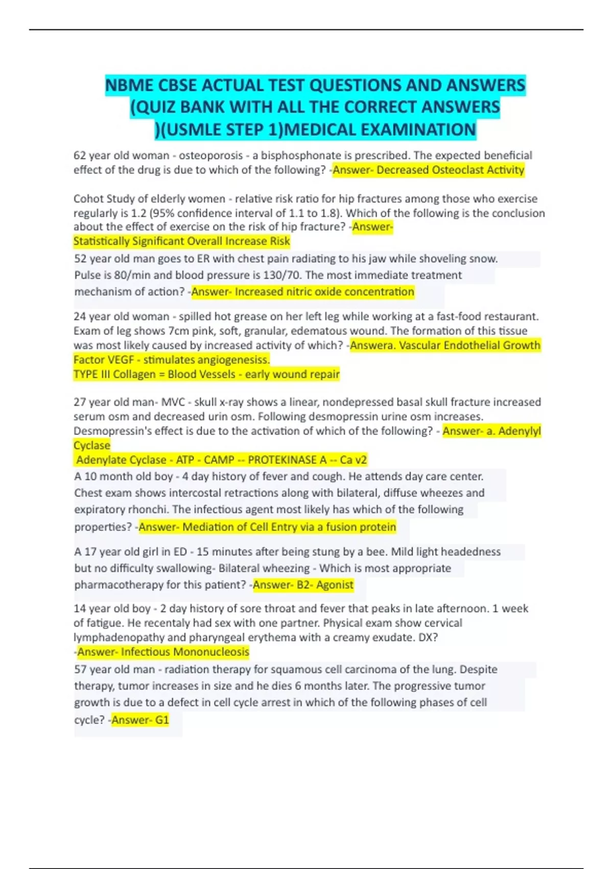 NBME CBSE ACTUAL TEST QUESTIONS AND ANSWERS (QUIZ BANK WITH ALL THE CORRECT ANSWERS )(USMLE STEP 1)MEDICAL EXAMINATION
