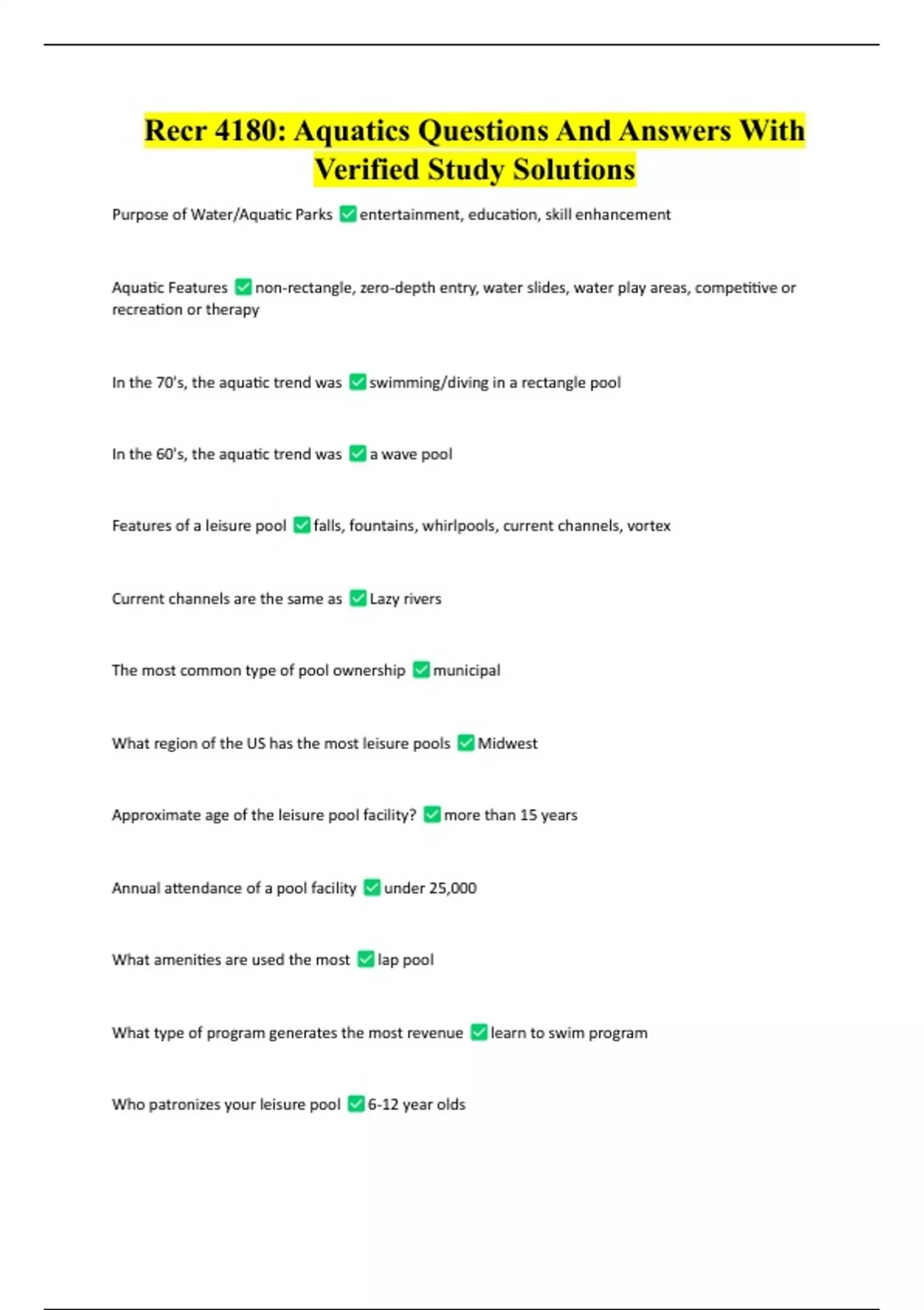 Recr 4180: Aquatics Questions And Answers With Verified Study Solutions Recr 4180: Aquatics Questions And Answers With Verified Study Solutions