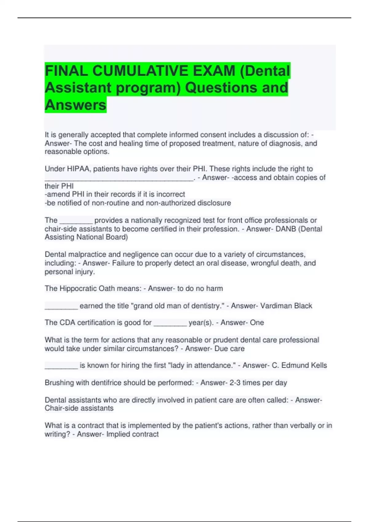 FINAL CUMULATIVE EXAM (Dental Assistant program) Questions and Answers