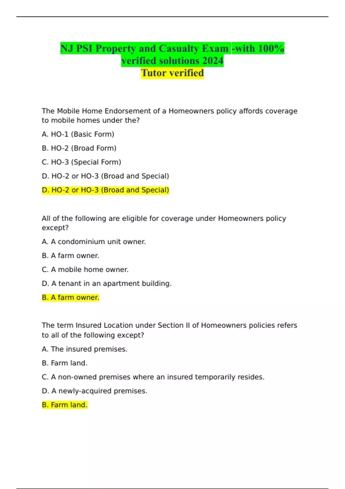 NJ PSI Property and Casualty Exam -with 100% verified solutions 2024