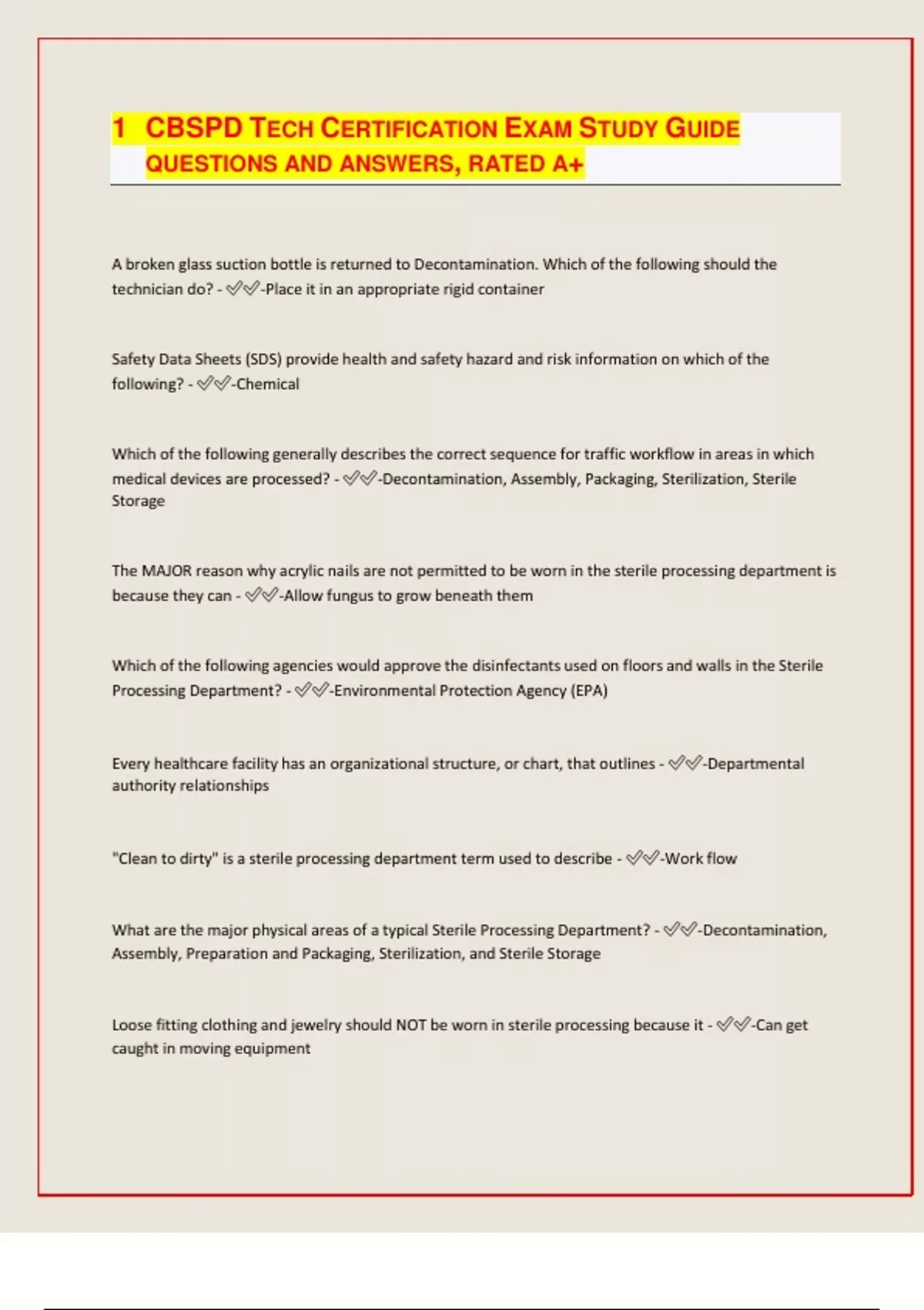 CBSPD TECH CERTIFICATION EXAM STUDY GUIDE QUESTIONS AND ANSWERS, RATED A+ A broken glass suction bottle is returned to Decontamination. Which of the following should the technician do? - -Place it in an appropriate rigid container Safety Data Sheets (SDS) provide health and safety hazard and risk information on which of the following? - -Chemical Which of the following generally describes the correct sequence for traffic workflow in areas in which medical devices are processed? - -Decontamination, Assembly, Packaging, Sterilization, Sterile Storage The MAJOR reason why acrylic nails are not permitted to be worn in the sterile processing department is because they can - -Allow fungus to grow beneath them Which of the following agencies would approve the disinfectants used on floors and walls in the Sterile Processing Department? - -Environmental Protection Agency (EPA) Every healthcare facility has an organizational structure, or chart, that outlines - -Departmental authority relationships "Clean to dirty" is a sterile processing department term used to describe - -Work flow What are the major physical areas of a typical Sterile Processing Department? - -Decontamination, Assembly, Preparation and Packaging, Sterilization, and Sterile Storage Loose fitting clothing and jewelry should NOT be worn in sterile processing because it - -Can get caught in moving equipment Hair coverings are REQUIRED - -In all areas of the department Decontamination procedures - -Reduce contamination to permit reprocessed medical devices to be sterilized A patient contracts an infection from an improperly sterilized surgical instrument. This is an example of - -A healthcare acquired infection Coronary artery bypass surgery may be performed on patients with - -Arteriosclerosis All of the following are classified as critical medical devices EXCEPT - -Thermometers The function of the gastrointestinal system is to - -Provide the body with nutrients A liver biopsy would be performed to check for which disease? - -Hepatitis C Virus The growth of pathogenic bacteria in living tissue is called - -Se