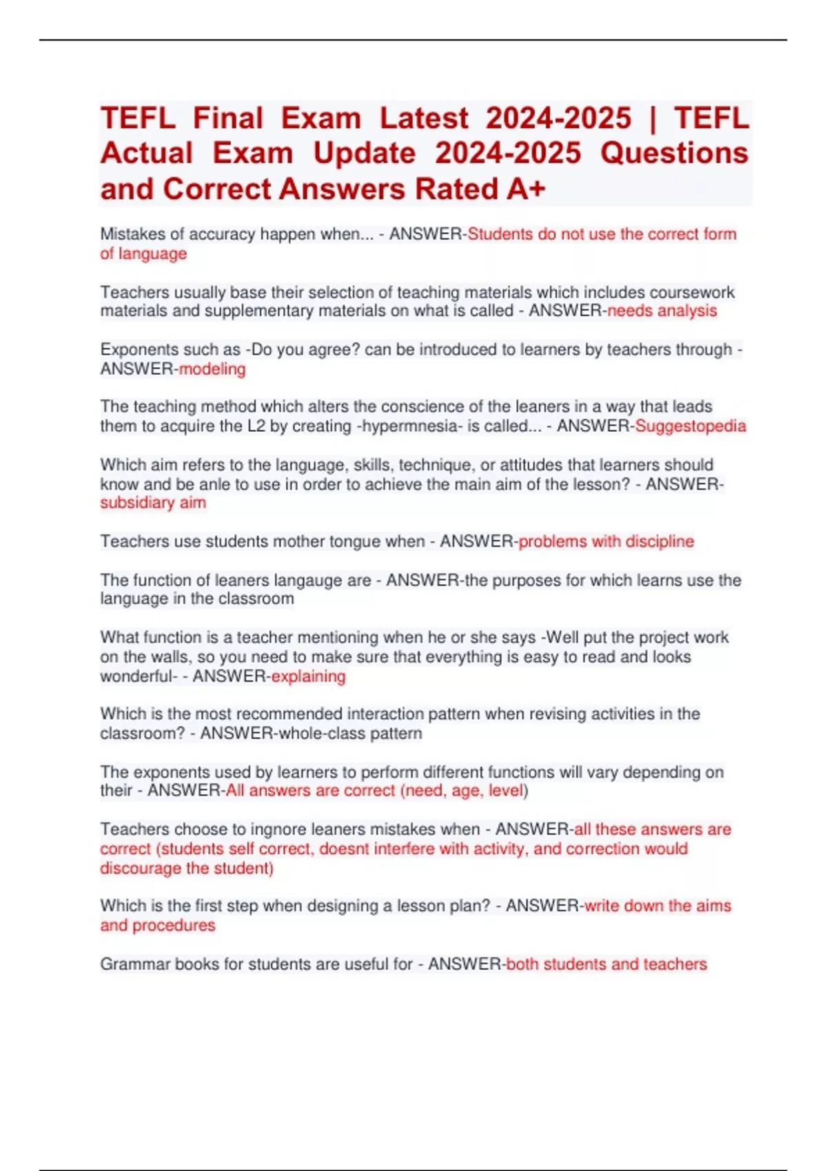 TEFL Final Exam Latest | TEFL Actual Exam Update Questions and Correct Answers Rated A+