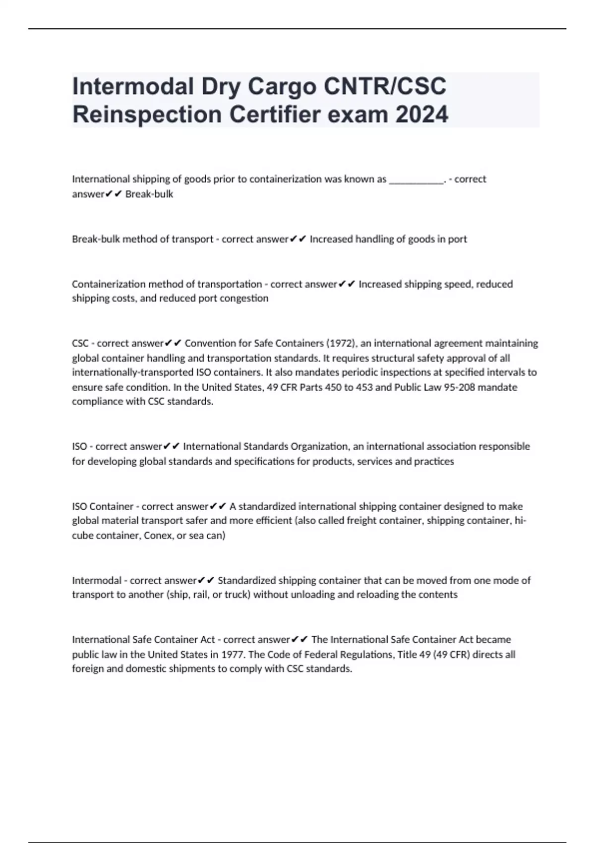 International shipping of goods prior to containerization was known as __________. - correct answer Break-bulk Break-bulk method of transport - correct answer Increased handling of goods in port Containerization method of transportation - correct answer Increased shipping speed, reduced shipping costs, and reduced port congestion CSC - correct answer Convention for Safe Containers (1972), an international agreement maintaining global container handling and transportation standards. It requires structural safety approval of all internationally-transported ISO containers. It also mandates periodic inspections at specified intervals to ensure safe condition. In the United States, 49 CFR Parts 450 to 453 and Public Law 95-208 mandate compliance with CSC standards. ISO - correct answer International Standards Organization, an international association responsible for developing global standards and specifications for products, services and practices ISO Container - correct answer A standardized international shipping container designed to make global material transport safer and more efficient (also called freight container, shipping container, hi-cube container, Conex, or sea can) Intermodal - correct answer Standardized shipping container that can be moved from one mode of transport to another (ship, rail, or truck) without unloading and reloading the contents International Safe Container Act - correct answer The International Safe Container Act became public law in the United States in 1977. The Code of Federal Regulations, Title 49 (49 CFR) directs all foreign and domestic shipments to comply with CSC standards.