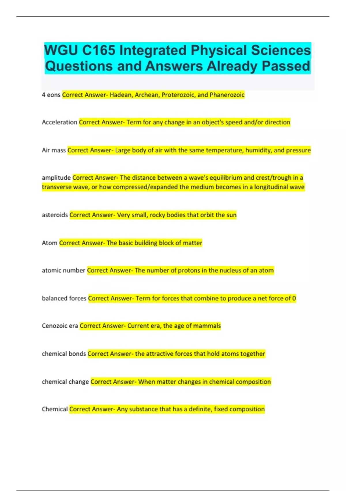 WGU C165 Integrated Physical Sciences Questions and Answers Already Passed 4 eons Correct Answer- Hadean, Archean, Proterozoic, and Phanerozoic Acceleration Correct Answer- Term for any change in an object's speed and/or direction Air mass Correct Answer- Large body of air with the same temperature, humidity, and pressure amplitude Correct Answer- The distance between a wave's equilibrium and crest/trough in a transverse wave, or how compressed/expanded the medium becomes in a longitudinal wave asteroids Correct Answer- Very small, rocky bodies that orbit the sun Atom Correct Answer- The basic building block of matter atomic number Correct Answer- The number of protons in the nucleus of an atom balanced forces Correct Answer- Term for forces that combine to produce a net force of 0 Cenozoic era Correct Answer- Current era, the age of mammals chemical bonds Correct Answer- the attractive forces that hold atoms together chemical change Correct Answer- When matter changes in chemical composition Chemical Correct Answer- Any substance that has a definite, fixed compositionchemical potential energy Correct Answer- Energy that is stored in the chemical bonds in a substance chemical reaction Correct Answer- When chemical bonds are formed/broken in a chemical change chemical weathering Correct Answer- Weathering resulting from chemical processes