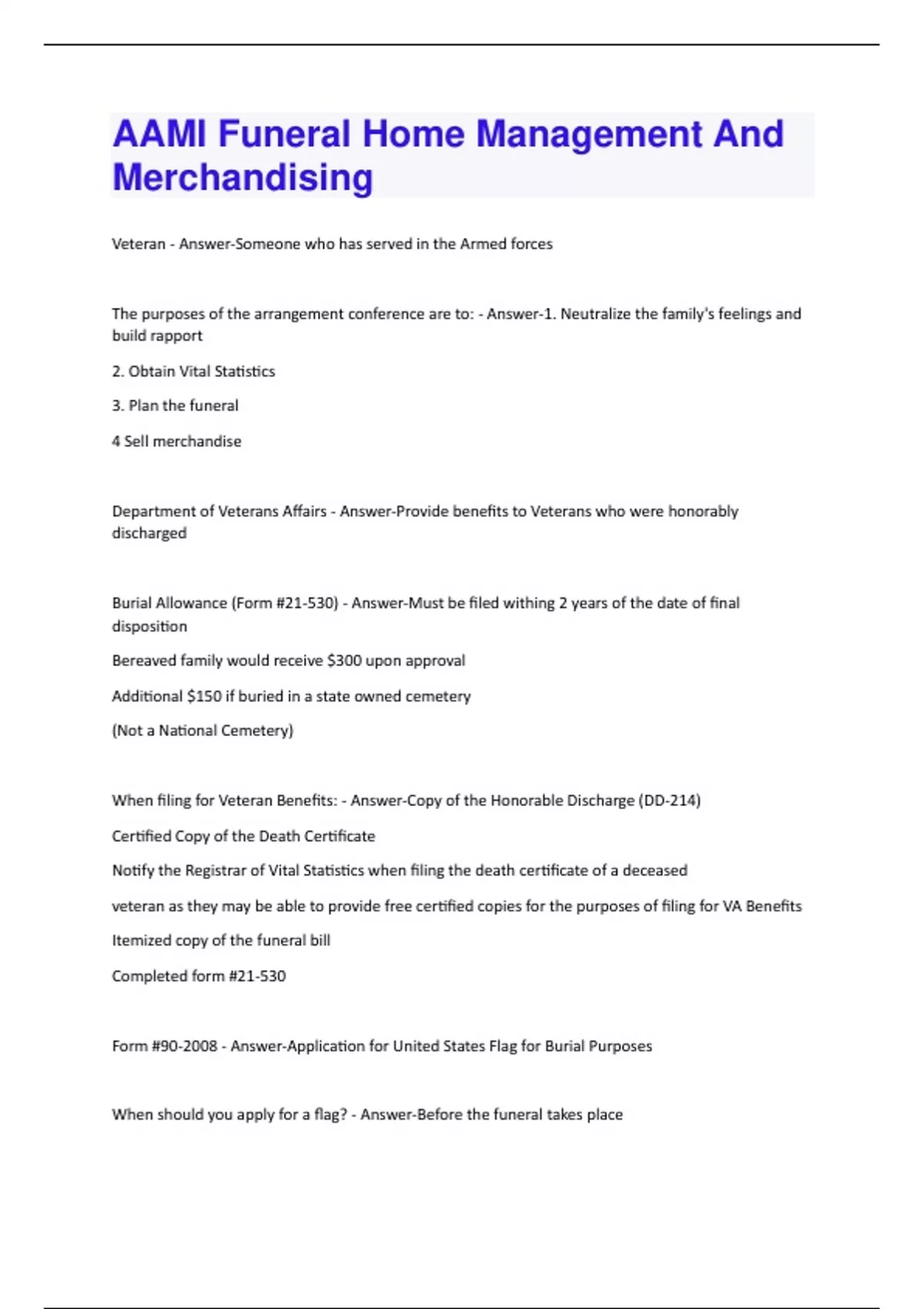 Veteran - Answer-Someone who has served in the Armed forces The purposes of the arrangement conference are to: - Answer-1. Neutralize the family's feelings and build rapport 2. Obtain Vital Statistics 3. Plan the funeral 4 Sell merchandise Department of Veterans Affairs - Answer-Provide benefits to Veterans who were honorably discharged Burial Allowance (Form #21-530) - Answer-Must be filed withing 2 years of the date of final disposition Bereaved family would receive $300 upon approval Additional $150 if buried in a state owned cemetery (Not a National Cemetery) When filing for Veteran Benefits: - Answer-Copy of the Honorable Discharge (DD-214) Certified Copy of the Death Certificate Notify the Registrar of Vital Statistics when filing the death certificate of a deceased veteran as they may be able to provide free certified copies for the purposes of filing for VA Benefits Itemized copy of the funeral bill Completed form #21-530 Form #90-2008 - Answer-Application for United States Flag for Burial Purposes When should you apply for a flag? - Answer-Before the funeral takes placeWhere can you obtain a flag? - Answer-At any first, second, or third class post office, at the fourth class post offices in the county seats or at any field station of the Veterans Administration (VA), including contact offices. The order of preference for signing the VA Form # 9 0-2008 is: - Answer-1. Next of kin or other relative; 2. Person making the funeral arrangements; 3. Funeral director 4. Representative of a veterans' organization having charge of the funeral; 5. Other person having knowledge of the eligibility of the deceased and acting in the interest of his (or her) family. The order of preference to entitlement of the flag: - Answer-1. Widow or widower 2. Children, according to age 3. Parents, adoptive parents, stepparents and foster parents 4. Brothers or sisters, including half-blood siblings 5. Uncles or aunts; 6. Nephews or nieces; 7. Others, cousins, grandparents, etc. If two relatives having equal entitlement request the flag? - Answer-It would go to the elder of the two Can a flag be issued to a widow/widower who is separated from the deceased? - Answer-Yes. As long as the widow/widower is not remarried. Can a flag be issued to a widow/widower who was separated from the deceased and then remarried? - Answer-No. Unless the application for the flag was made prior to the remarriage. Form #40-1330 - Answer-Application for Headstone / Marker.What is the time limit for filing for a Headstone/Marker? - Answer-There is no time limit. The nearest relative, funeral director or other person may request a headstone or marker when: - Answer-When interment is in a cemetery other than a Veterans Administration or National Cemetery Filing for a Headstone/Marker - Answer-Completed form #40-1330 and a copy of Honorable Discharge (DD-214) The V.A. will pay the cost of transportation when: - Answer-When a Veteran dies as a result of a Service-Connected Disability and is in receipt of disability compensation Members of the Armed Forces who die while on active duty can receive what kinds of Government benefits? - Answer-Preparation of the deceased, dressing and casketing, transportation and the aforementioned burial benefits In the event an active service person dies in an area where there is no contract for funeral services, the local funeral home should use what form? - Answer-Form #DD-1375 Burial at sea is available to: - Answer-1. members and former members of Uniformed Services 2. U.S. Civilian Marine Personnel of the Military Sealift Command. 3. Dependents of members and former members of Uniformed Services 4. U.S. Citizens who by notable service or by outstanding contributions to the U.S. are eligible What kind of casket is needed for a burial at sea? - Answer-A metal casket The metal casket will be drilled with twelve holes, two inches in diameter in the top, bottom and sides of the casket. Why? - Answer-In order to allow a better flow of sea water to sink the casket. The metal casket would be enclosed with six metal or durable fabric bands ¾ inches wide to: - Answer-Assure that the casket lid will not open on impact with the water Does the family pay to transport the deceased to the location designated by the Commandant of the Naval District? - Answer-YesAre civilians normally allowed to attend services aboard Navy ships at sea? - Answer-No Form #SSA 721 - Answer-Statement of Death by Funeral Director What is the purpose of Form #SSA 721? - Answer-1. Notifies Social Security that someone has died. 2. Starts the process for a family member or members to receive possible Social Security benefits Lump Sum Death Benefit: - Answer-1. The amount is $255.00 2. Paid to surviving spouse or dependent child only 3. Must be claimed within two years from the date of death 4. Social Security contacts the family via the Statement of Death From to file for the LSDB, if eligible. 5. The Claimant's Form is SSA 8. If both spouses are receiving Social Security benefits and one dies, will the survivor receive both payment? - Answer-The survivor will receive whichever payment is larger, but will NOT continue to receive both payments. For direct deposit of a social security check, the bank will: - Answer-Have to be notified of the persons death.
