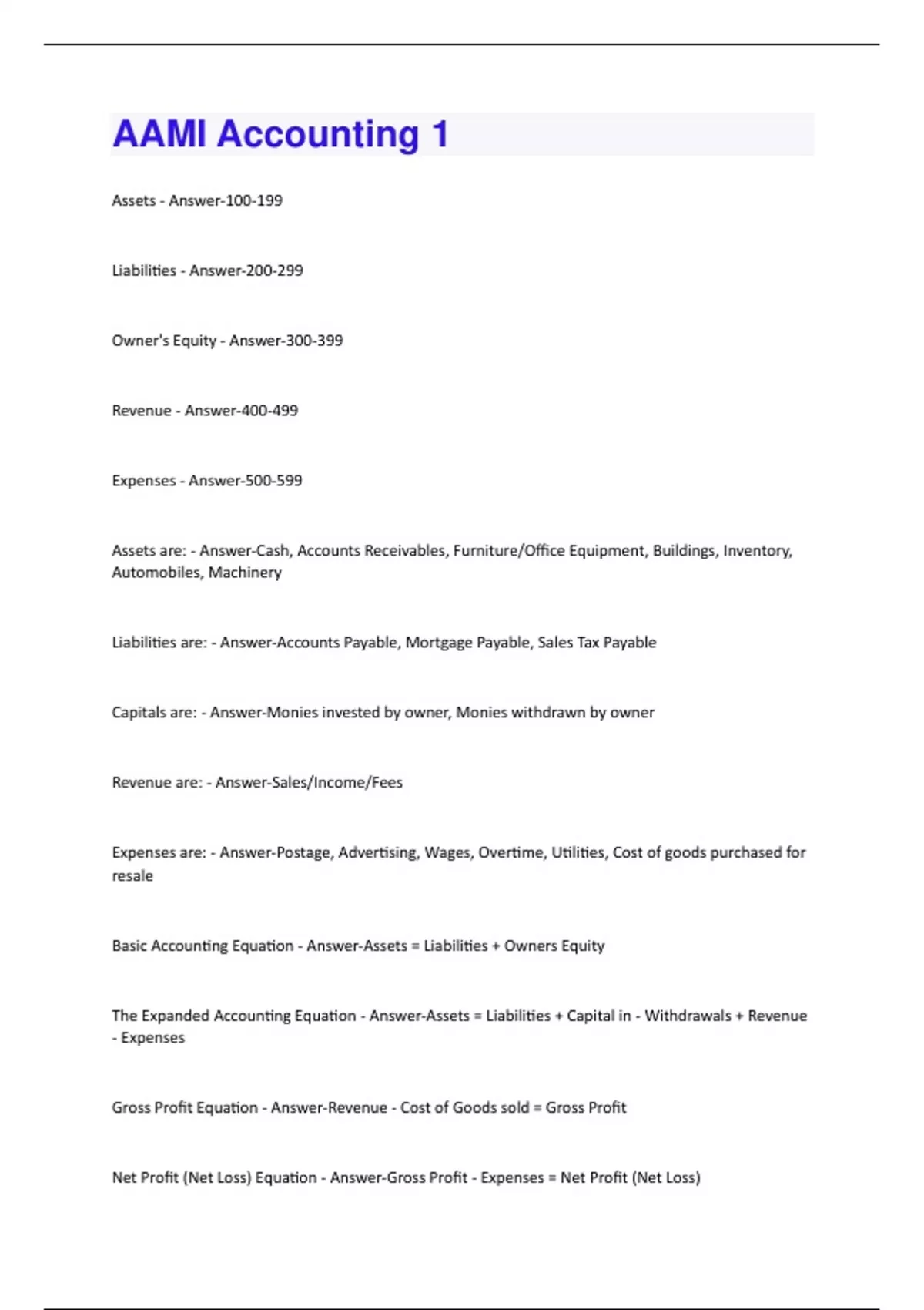 Assets - Answer-100-199 Liabilities - Answer-200-299 Owner's Equity - Answer-300-399 Revenue - Answer-400-499 Expenses - Answer-500-599 Assets are: - Answer-Cash, Accounts Receivables, Furniture/Office Equipment, Buildings, Inventory, Automobiles, Machinery Liabilities are: - Answer-Accounts Payable, Mortgage Payable, Sales Tax Payable Capitals are: - Answer-Monies invested by owner, Monies withdrawn by owner Revenue are: - Answer-Sales/Income/Fees Expenses are: - Answer-Postage, Advertising, Wages, Overtime, Utilities, Cost of goods purchased for resale Basic Accounting Equation - Answer-Assets = Liabilities + Owners Equity The Expanded Accounting Equation - Answer-Assets = Liabilities + Capital in - Withdrawals + Revenue - Expenses Gross Profit Equation - Answer-Revenue - Cost of Goods sold = Gross Profit Net Profit (Net Loss) Equation - Answer-Gross Profit - Expenses = Net Profit (Net Loss)Increases to Assets and Expenses are: - Answer-Debits Increases to Liabilities, Capital and Revenue are : - Answer-Credits Decreases to Assets and Expenses are: - Answer-Credits Decreases to Liabilities, Capital and Revenue are: - Answer-Debits Assets and Expense accounts should have _____ Balances. - Answer-Debit Balances Liability, Capital and Revenue Accounts should have _____ Balances. - Answer-Credit Balances TRIAL BALANCE - Answer-Simply proves the equality of debits to credits 3 Formal Financial Statements are: - Answer-Income Statement (or profit/loss statement) Statement of Owner's Equity Balance Sheet