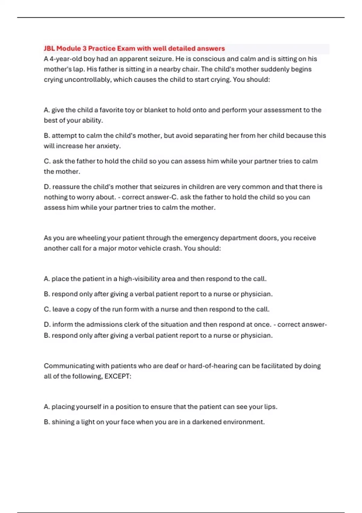 B. respond only after giving a verbal patient report to a nurse or physician. Communicating with patients who are deaf or hard -of-hearing can be facilitated by doing all of the following, EXCEPT: A. placing yourself in a position to ensure that the patient can see your lips. B. shining a light on your face when you are in a darkened environment. C. providing pen and paper if the patient prefers to write his or her response. D. elevating the tone of your voice and exaggerating word pronunciation. - correct answer -
