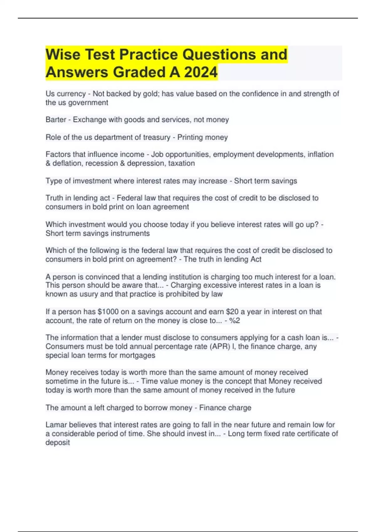 Us currency - Not backed by gold; has value based on the confidence in and strength of the us government Barter - Exchange with goods and services, not money Role of the us department of treasury - Printing money Factors that influence income - Job opportunities, employment developments, inflation & deflation, recession & depression, taxation Type of imvestment where interest rates may increase - Short term savings Truth in lending act - Federal law that requires the cost of credit to be disclosed to consumers in bold print on loan agreement Which investment would you choose today if you believe interest rates will go up? - Short term savings instruments Which of the following is the federal law that requires the cost of credit be disclosed to consumers in bold print on agreement? - The truth in lending Act A person is convinced that a lending institution is charging too much interest for a loan. This person should be aware that... - Charging excessive interest rates in a loan is known as usury and that practice is prohibited by law If a person has $1000 on a savings account and earn $20 a year in interest on that account, the rate of return on the money is close to... - %2 The information that a lender must disclose to consumers applying for a cash loan is... - Consumers must be told annual percentage rate (APR) l, the finance charge, any special loan terms for mortgages Money receives today is worth more than the same amount of money received sometime in the future is... - Time value money is the concept that Money received today is worth more than the same amount of money received in the future The amount a left charged to borrow money - Finance charge Lamar believes that interest rates are going to fall in the near future and remain low for a considerable period of time. She should invest in... - Long term fixed rate certificate of deposit