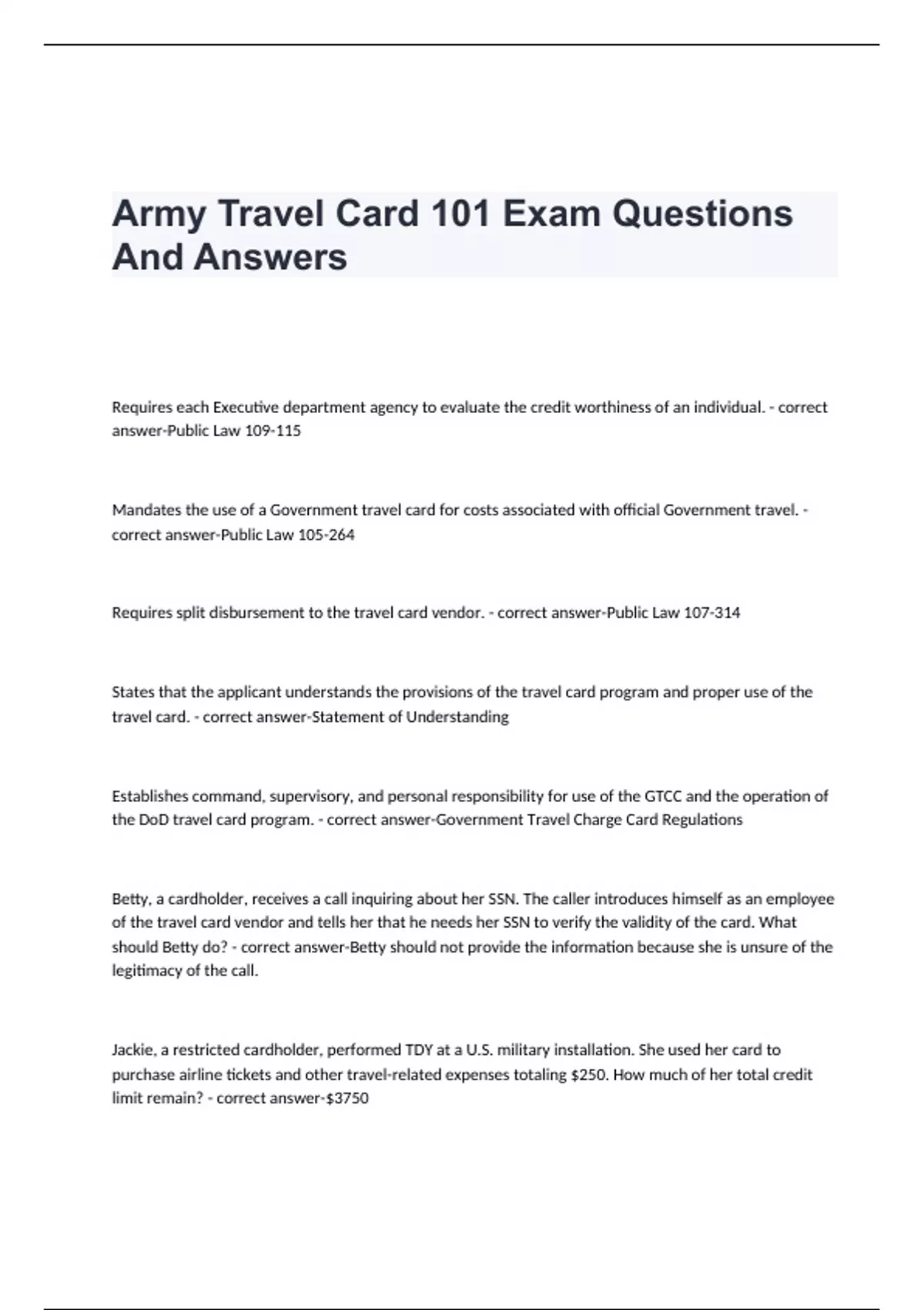 Requires each Executive department agency to evaluate the credit worthiness of an individual. - correct answer-Public Law 109-115 Mandates the use of a Government travel card for costs associated with official Government travel. - correct answer-Public Law 105-264 Requires split disbursement to the travel card vendor. - correct answer-Public Law 107-314 States that the applicant understands the provisions of the travel card program and proper use of the travel card. - correct answer-Statement of Understanding Establishes command, supervisory, and personal responsibility for use of the GTCC and the operation of the DoD travel card program. - correct answer-Government Travel Charge Card Regulations Betty, a cardholder, receives a call inquiring about her SSN. The caller introduces himself as an employee of the travel card vendor and tells her that he needs her SSN to verify the validity of the card. What should Betty do? - correct answer-Betty should not provide the information because she is unsure of the legitimacy of the call. Jackie, a restricted cardholder, performed TDY at a U.S. military installation. She used her card to purchase airline tickets and other travel-related expenses totaling $250. How much of her total credit limit remain? - correct answer-$3750