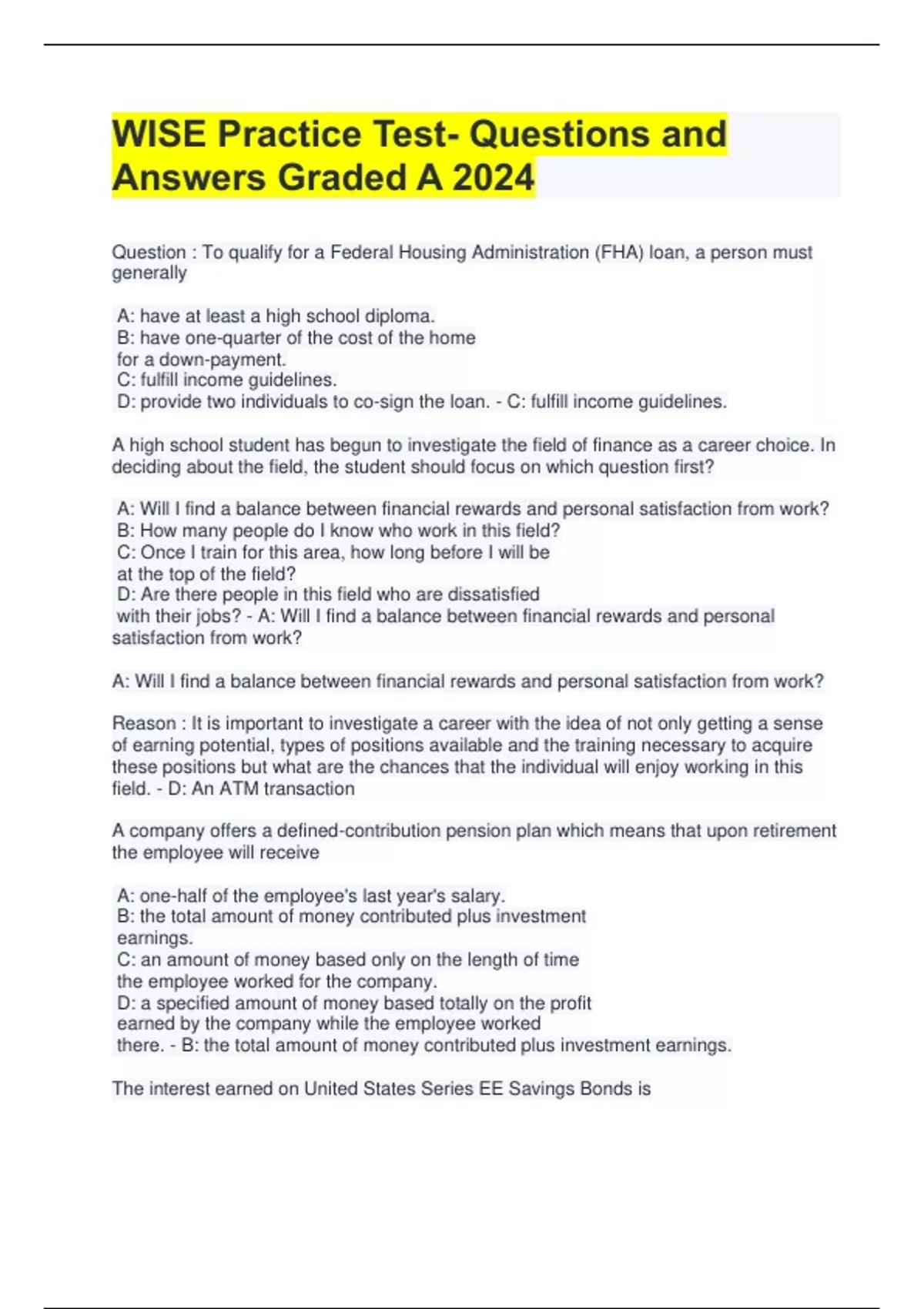 Question : To qualify for a Federal Housing Administration (FHA) loan, a person must generally A: have at least a high school diploma. B: have one-quarter of the cost of the home for a down-payment. C: fulfill income guidelines. D: provide two individuals to co-sign the loan. - C: fulfill income guidelines. A high school student has begun to investigate the field of finance as a career choice. In deciding about the field, the student should focus on which question first? A: Will I find a balance between financial rewards and personal satisfaction from work? B: How many people do I know who work in this field? C: Once I train for this area, how long before I will be at the top of the field? D: Are there people in this field who are dissatisfied with their jobs? - A: Will I find a balance between financial rewards and personal satisfaction from work? A: Will I find a balance between financial rewards and personal satisfaction from work? Reason : It is important to investigate a career with the idea of not only getting a sense of earning potential, types of positions available and the training necessary to acquire these positions but what are the chances that the individual will enjoy working in this field. - D: An ATM transaction A company offers a defined-contribution pension plan which means that upon retirement the employee will receive A: one-half of the employee's last year's salary. B: the total amount of money contributed plus investment earnings. C: an amount of money based only on the length of time the employee worked for the company. D: a specified amount of money based totally on the profit earned by the company while the employee worked there. - B: the total amount of money contributed plus investment earnings. The interest earned on United States Series EE Savings Bonds is A: exempt from state and local taxes. B: paid in a lump sum at the time the face value on the bond is reached. C: equal to the money paid to purchase it. - A: exempt from state and local taxes. Reason : The interest rate on US savings bonds is exempt from state and local taxes. Buying a treasury bill (T-bill) is best for investors who are looking for A: a place to invest between $100-$500. B: a secure, low risk investment. C: a higher yield on their investment than corporate bonds offer. D: an investment that matures in 10-30 years. - B: a secure, low, risk investment. Reason : These bills are backed by the full faith and credit of the US government, therefore considered relatively risk free. Using a brokerage firm, a qualified investor buys 1000 shares of a common stock at $50 a share on 50% margin. This means that the A: investor will pay only $5000 for the shares. B: investor is buying 2000 shares. C: brokerage firm is lending the investor 50% of the money. D: brokerage firm will own 50% of the 1000 shares of stock that were purchased. - C: brokerage firm is lending the investor 50% of the money. Reason : Margin is a speculative method whereby an investor borrows up to 50% of the money needed from a brokerage firm in order to buy a wanted stock and pays a fee for the privilege. To determine the time value of depositing $100 in a savings account, a person needs to know the interest rate and A: her total income. B: the rate of inflation. C: whether the account is FDIC protected. D: whether the bank offers overdraft protection. - B: the rate of inflation. The amount a lender charges to borrow money is called the: A: Principal B: Annual Percentage Rate (APR) C: Loan balance D: Finance charge - Correct Answer : D: Finance charge The cost to use someone else's money for a period of time is called the: