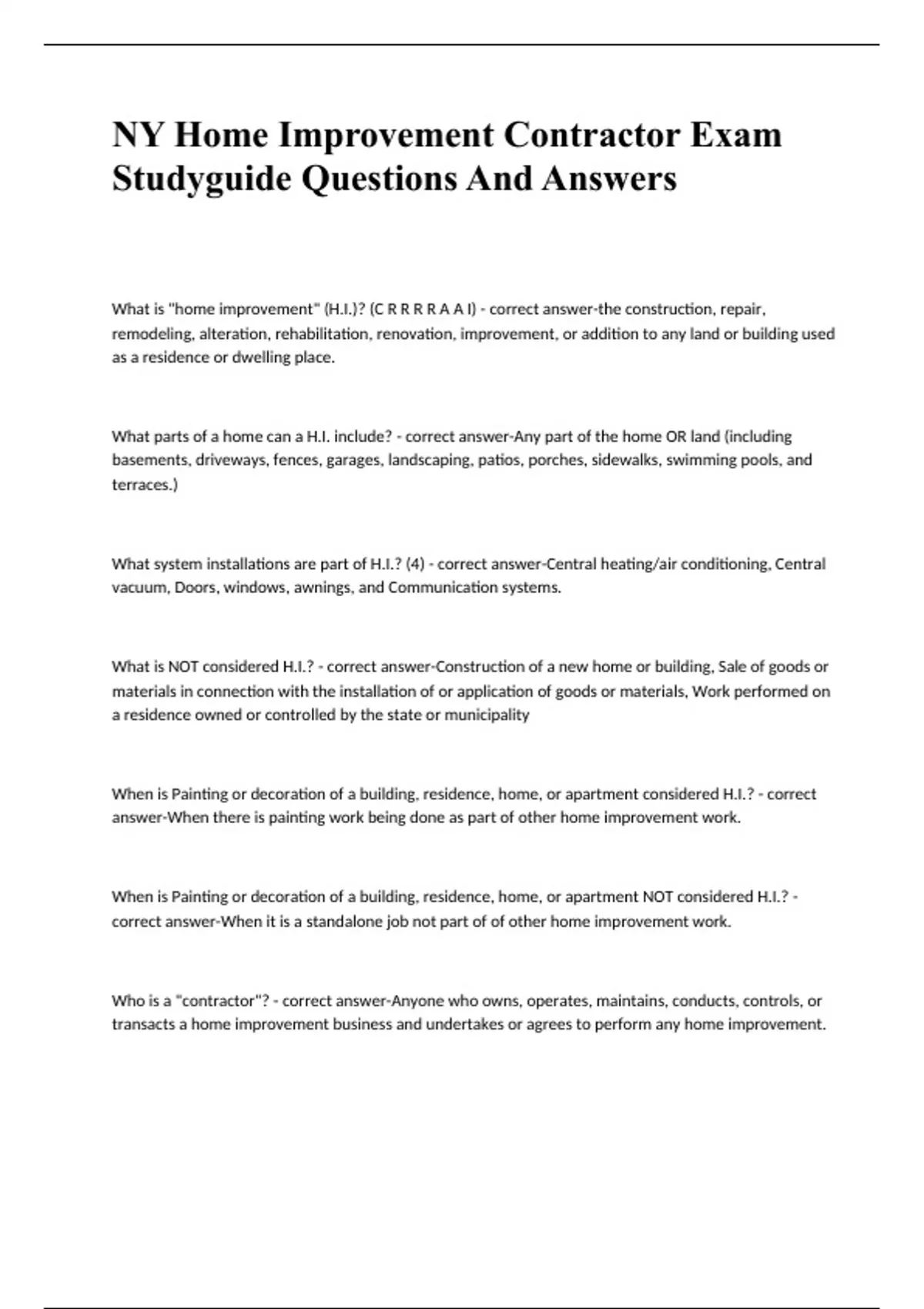 NY Home Improvement Contractor Exam Studyguide