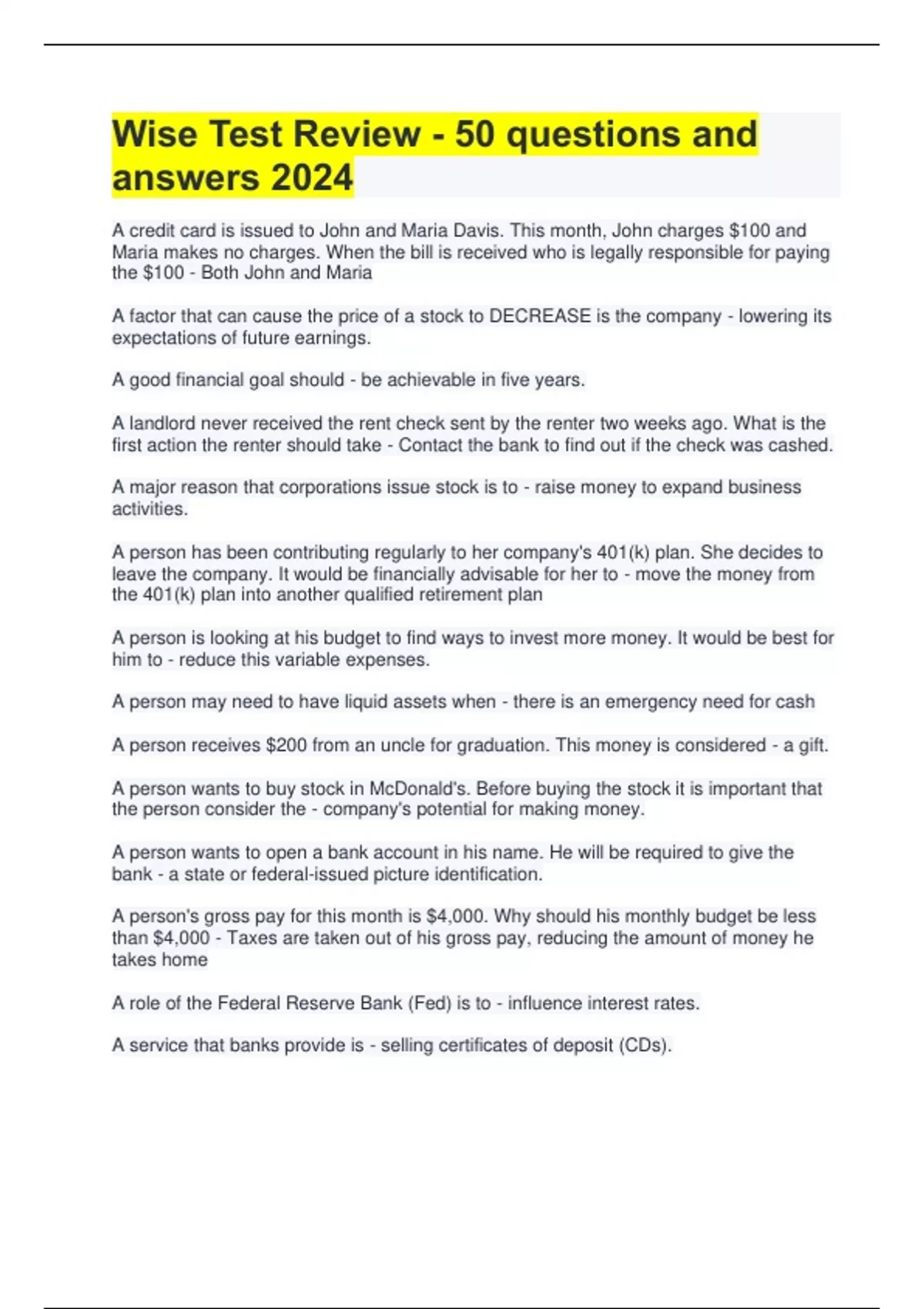 A credit card is issued to John and Maria Davis. This month, John charges $100 and Maria makes no charges. When the bill is received who is legally responsible for paying the $100 - Both John and Maria A factor that can cause the price of a stock to DECREASE is the company - lowering its expectations of future earnings. A good financial goal should - be achievable in five years. A landlord never received the rent check sent by the renter two weeks ago. What is the first action the renter should take - Contact the bank to find out if the check was cashed. A major reason that corporations issue stock is to - raise money to expand business activities. A person has been contributing regularly to her company's 401(k) plan. She decides to leave the company. It would be financially advisable for her to - move the money from the 401(k) plan into another qualified retirement plan A person is looking at his budget to find ways to invest more money. It would be best for him to - reduce this variable expenses. A person may need to have liquid assets when - there is an emergency need for cash A person receives $200 from an uncle for graduation. This money is considered - a gift. A person wants to buy stock in McDonald's. Before buying the stock it is important that the person consider the - company's potential for making money. A person wants to open a bank account in his name. He will be required to give the bank - a state or federal-issued picture identification. A person's gross pay for this month is $4,000. Why should his monthly budget be less than $4,000 - Taxes are taken out of his gross pay, reducing the amount of money he takes home A role of the Federal Reserve Bank (Fed) is to - influence interest rates. A service that banks provide is - selling certificates of deposit (CDs).