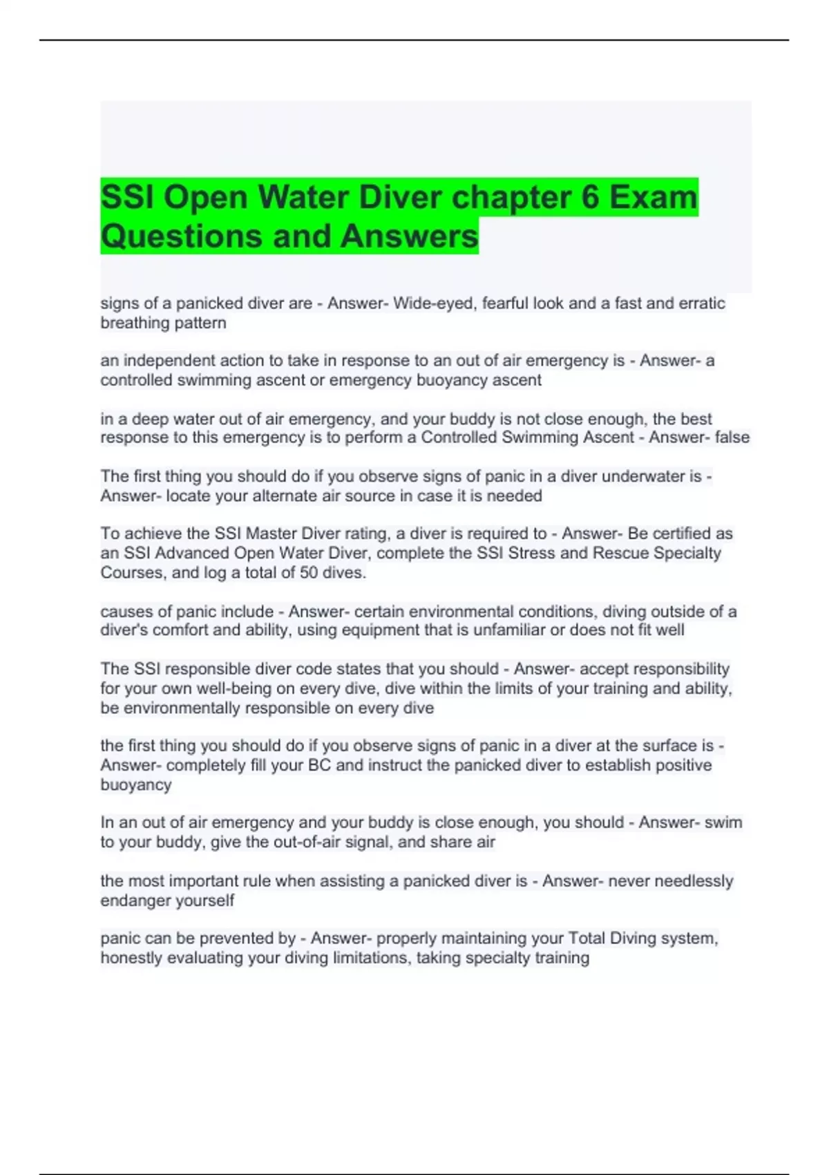ssi open water diver chapter 6 exam questions and