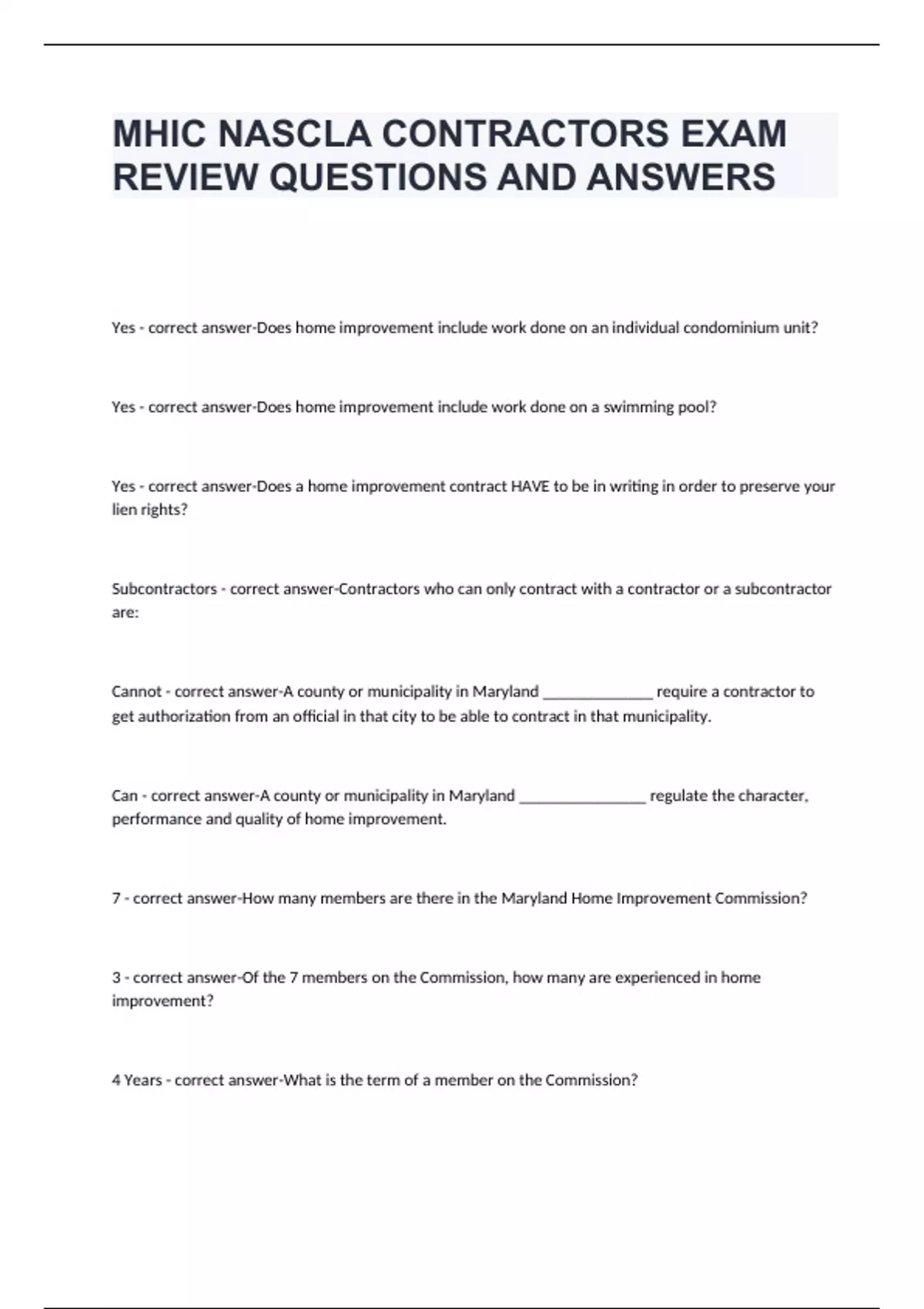 MHIC NASCLA CONTRACTORS EXAM REVIEW QUESTIONS AND ANSWERS