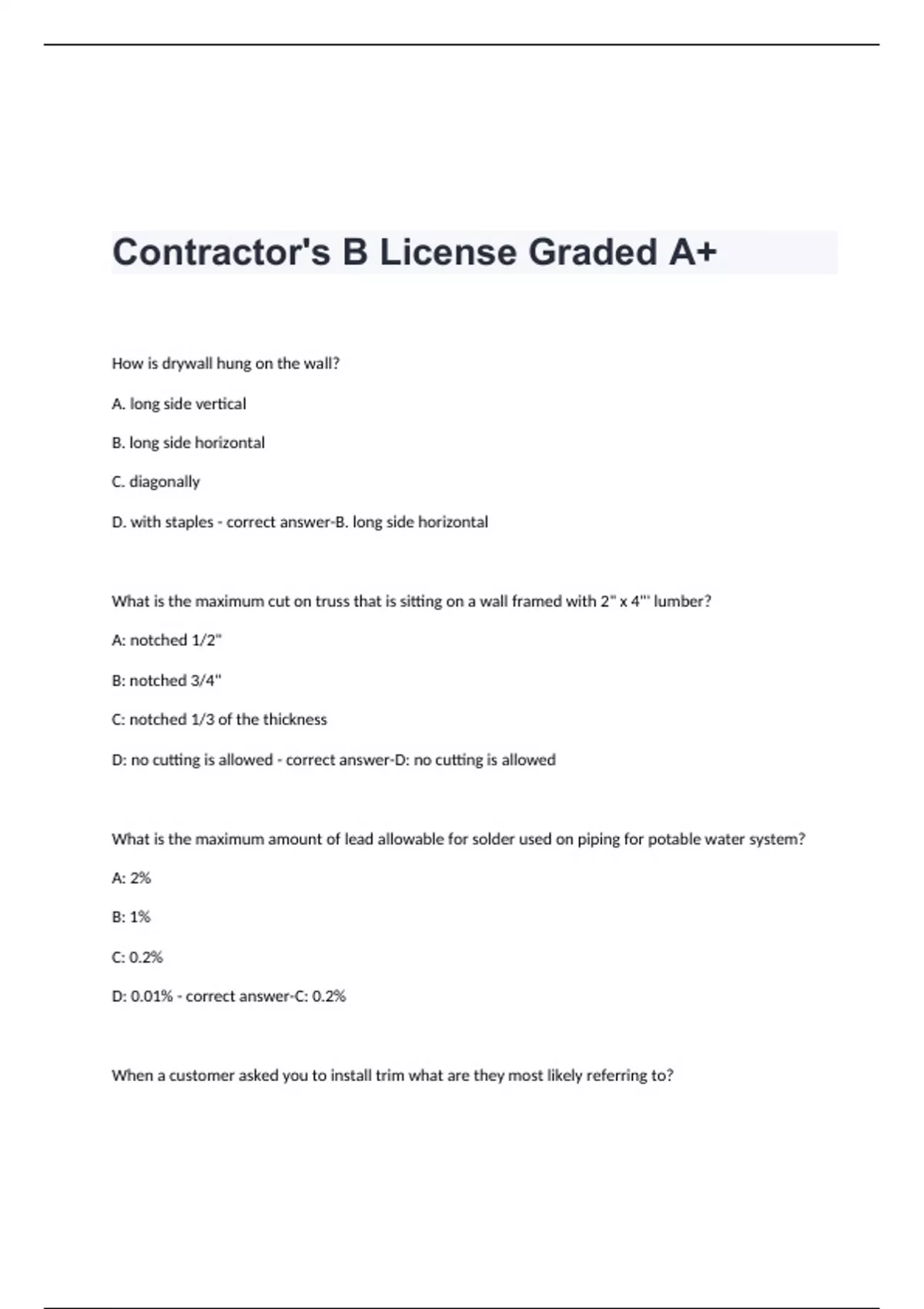 How is drywall hung on the wall? A. long side vertical B. long side horizontal C. diagonally D. with staples - correct answer-B. long side horizontal What is the maximum cut on truss that is sitting on a wall framed with 2" x 4"' lumber? A: notched 1/2" B: notched 3/4" C: notched 1/3 of the thickness D: no cutting is allowed - correct answer-D: no cutting is allowed What is the maximum amount of lead allowable for solder used on piping for potable water system? A: 2% B: 1% C: 0.2% D: 0.01% - correct answer-C: 0.2% When a customer asked you to install trim what are they most likely referring to?