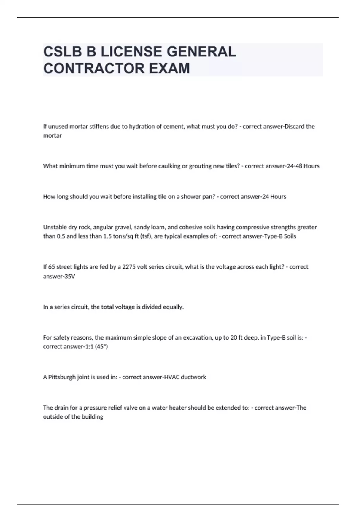 If unused mortar stiffens due to hydration of cement, what must you do? - correct answer-Discard the mortar What minimum time must you wait before caulking or grouting new tiles? - correct answer-24-48 Hours How long should you wait before installing tile on a shower pan? - correct answer-24 Hours Unstable dry rock, angular gravel, sandy loam, and cohesive soils having compressive strengths greater than 0.5 and less than 1.5 tons/sq ft (tsf), are typical examples of: - correct answer-Type-B Soils If 65 street lights are fed by a 2275 volt series circuit, what is the voltage across each light? - correct answer-35V In a series circuit, the total voltage is divided equally. For safety reasons, the maximum simple slope of an excavation, up to 20 ft deep, in Type-B soil is: - correct answer-1:1 (45°) A Pittsburgh joint is used in: - correct answer-HVAC ductwork The drain for a pressure relief valve on a water heater should be extended to: - correct answer-The outside of the building