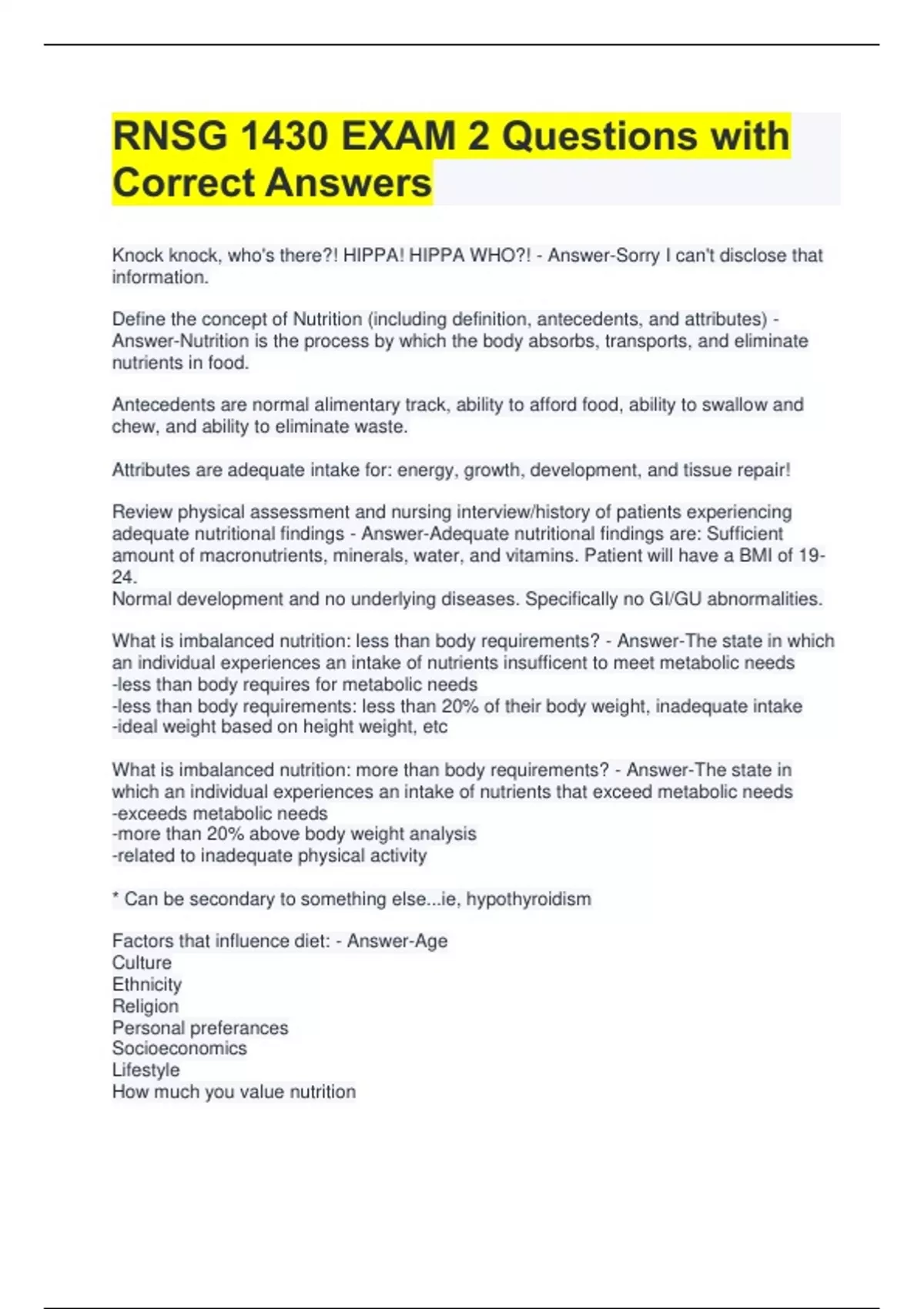 RNSG 1430 EXAM 2 Questions with Correct Answers Knock knock, who's there?! HIPPA! HIPPA WHO?! - Answer-Sorry I can't disclose that information. Define the concept of Nutrition (including definition, antecedents, and attributes) - Answer-Nutrition is the process by which the body absorbs, transports, and eliminate nutrients in food. Antecedents are normal alimentary track, ability to afford food, ability to swallow and chew, and ability to eliminate waste. Attributes are adequate intake for: energy, growth, development, and tissue repair! Review physical assessment and nursing interview/history of patients experiencing adequate nutritional findings - Answer-Adequate nutritional findings are: Sufficient amount of macronutrients, minerals, water, and vitamins. Patient will have a BMI of 19- 24. Normal development and no underlying diseases. Specifically no GI/GU abnormalities. What is imbalanced nutrition: less than body requirements? - Answer-The state in which an individual experiences an intake of nutrients insufficent to meet metabolic needs -less than body requires for metabolic needs -less than body requirements: less than 20% of their body weight, inadequate intake -ideal weight based on height weight, etc What is imbalanced nutrition: more than body requirements? - Answer-The state in which an individual experiences an intake of nutrients that exceed metabolic needs -exceeds metabolic needs -more than 20% above body weight analysis -related to inadequate physical activity * Can be secondary to something else...ie, hypothyroidism Factors that influence diet: - Answer-Age Culture Ethnicity Religion Personal preferances Socioeconomics Lifestyle How much you value nutrition Media and advertising How we feel about food Medical issues and drugs Lab Tests from Mrs. Hobbs PP - Answer-Hemoglobin- 14-18 g/dl (men) 12-16g/dl (women) Hematocrit- 42-52% (men) 37-47% (women) Total lymphocyte count- 8.6- 45.3 Blood glucose- 70-110 Albumin- 3.5- 5.0 BUN- 10-20 Creatinine excretion- 0.6-1.3 Transferrin 200-400 mg/L Cholesterol levels 160-200 mg/dl Nitrogen Balance- urinary urea nitrogen Some more from her PP - Answer-A1C- 3 month average of blood sugars <6% B12- > 20 pg/mL Sodium 135-147 Potassium 3.5-5.2 Calcium 8.8-10.3 Magnesium 1.6-2.4 Chloride 95- 107 Phosphate 3.5-4.5 Folic acid (B9) vitamin/adults 2-2O Iron- 65-100 LFT's Liver function studies to see how well the liver is working: ALT, ALT, alkaline phosphatase, PT, INR, albumin, bilirubin Protein primarily measures albumin and globulin adult 6.0-8.3 gm/dL Renal Studies Lab/bun, creatinine, blood and urine flow, nuclear medicine TIBC (total iron binding capacity) 65-177 mg/dL females 50-170mg/dL Thiamine (B1) 2.5-.5mg/dL BMI - Answer-<15 Anorexic <19 Underweight 19-24 Normal 25-29 Obese 30-34 Class I Obesity 35-39 Class II Obesity >40 Class III Obesity