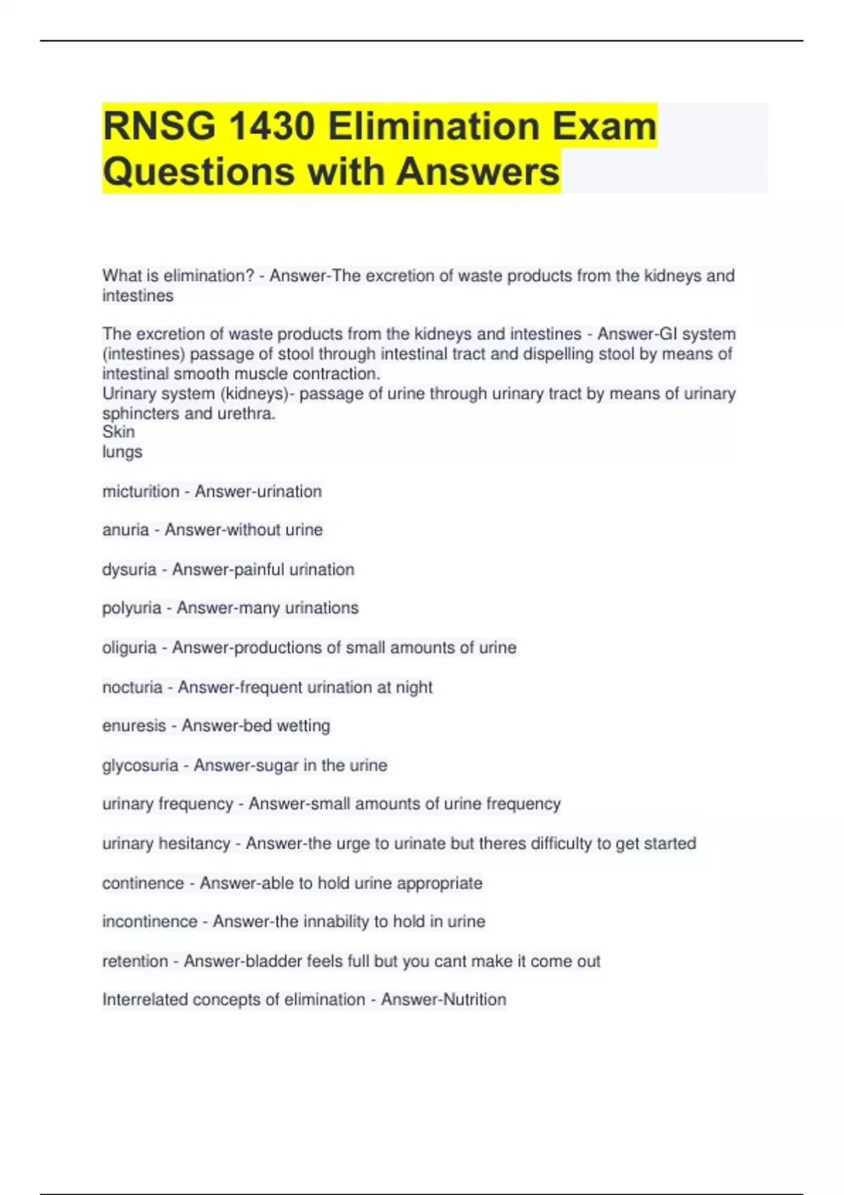RNSG 1430 Elimination Exam Questions with Answers What is elimination? - Answer-The excretion of waste products from the kidneys and intestines The excretion of waste products from the kidneys and intestines - Answer-GI system (intestines) passage of stool through intestinal tract and dispelling stool by means of intestinal smooth muscle contraction. Urinary system (kidneys)- passage of urine through urinary tract by means of urinary sphincters and urethra. Skin lungs micturition - Answer-urination anuria - Answer-without urine dysuria - Answer-painful urination polyuria - Answer-many urinations oliguria - Answer-productions of small amounts of urine nocturia - Answer-frequent urination at night enuresis - Answer-bed wetting glycosuria - Answer-sugar in the urine urinary frequency - Answer-small amounts of urine frequency urinary hesitancy - Answer-the urge to urinate but theres difficulty to get started continence - Answer-able to hold urine appropriate incontinence - Answer-the innability to hold in urine retention - Answer-bladder feels full but you cant make it come out Interrelated concepts of elimination - Answer-Nutrition Fluids and Electrolytes Acid base balance Mobility Cognition Coping bladder elimination antecedents - Answer-Urge to urinate Feeling of fullness or possible contraction of bladder bladder elimination attributes - Answer-Presence of urine Passage of urine Retention of urine Color of urine Frequency of urination Amount of urine bowel elimination antecedents - Answer-Urge to defecate Possible intestinal cramping or feeling of fullness in rectum bowel elimination attributes - Answer-Presence of stool/feces Passage of stool Form of stool Color of stool Frequency of stool passage Retention of stool The production and excretion of urine pathway - Answer-Kidneys Ureters Bladder urethra Urinary Elimination - Answer--Normally occurs under voluntary control. -Kidneys are responsible for removal of metabolic waste and other elements from the blood in the form of urine. function of the kidneys - Answer-regulate the volume and composition of ECF and excrete waste products (such as byproducts of drugs, excess minerals, vitamins and electrolytes) from the body. They also function to -control BP -activate vit D -Regulate acid base balance