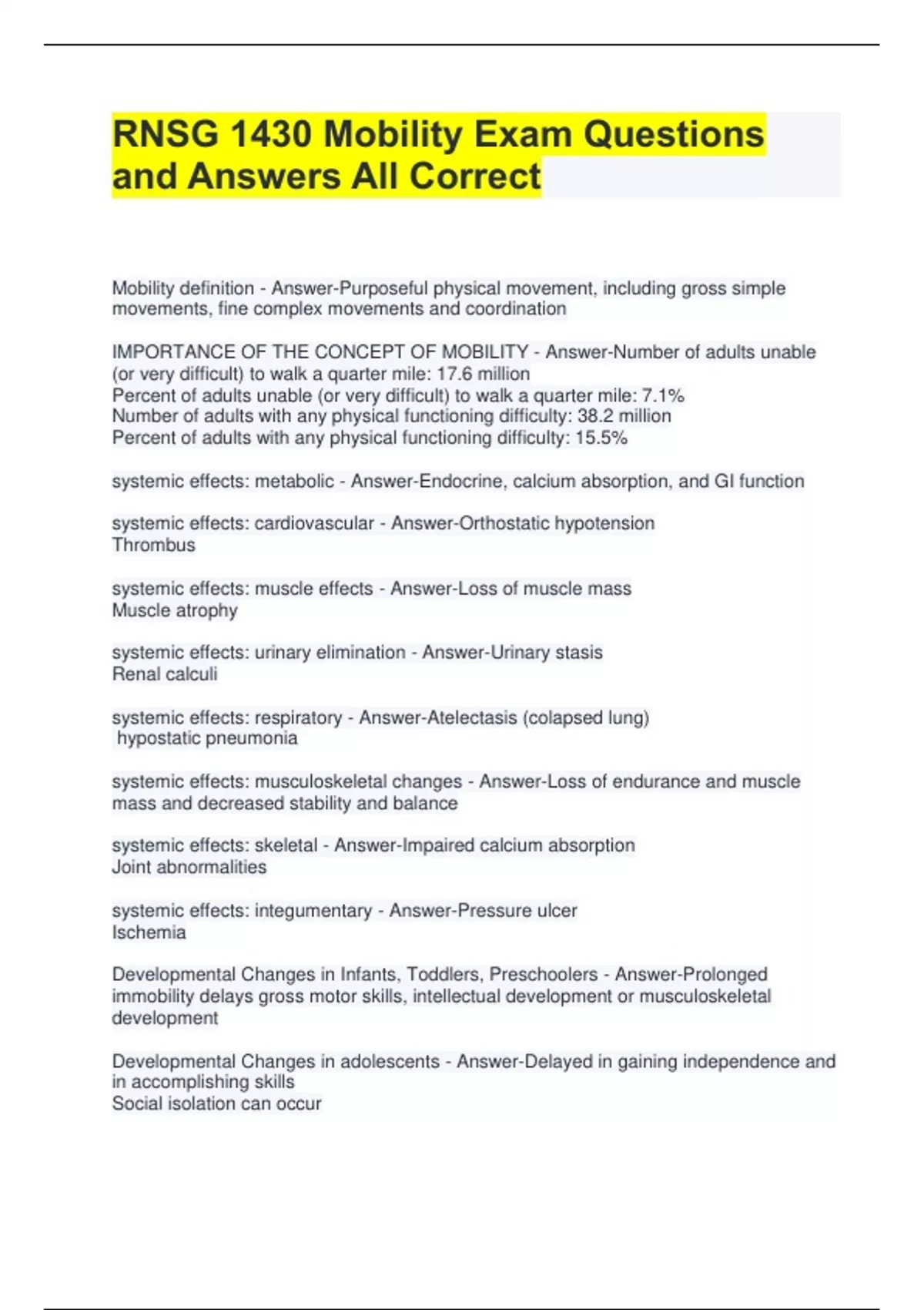 RNSG 1430 Mobility Exam Questions and Answers All Correct Mobility definition - Answer-Purposeful physical movement, including gross simple movements, fine complex movements and coordination IMPORTANCE OF THE CONCEPT OF MOBILITY - Answer-Number of adults unable (or very difficult) to walk a quarter mile: 17.6 million Percent of adults unable (or very difficult) to walk a quarter mile: 7.1% Number of adults with any physical functioning difficulty: 38.2 million Percent of adults with any physical functioning difficulty: 15.5% systemic effects: metabolic - Answer-Endocrine, calcium absorption, and GI function systemic effects: cardiovascular - Answer-Orthostatic hypotension Thrombus systemic effects: muscle effects - Answer-Loss of muscle mass Muscle atrophy systemic effects: urinary elimination - Answer-Urinary stasis Renal calculi systemic effects: respiratory - Answer-Atelectasis (colapsed lung) hypostatic pneumonia systemic effects: musculoskeletal changes - Answer-Loss of endurance and muscle mass and decreased stability and balance systemic effects: skeletal - Answer-Impaired calcium absorption Joint abnormalities systemic effects: integumentary - Answer-Pressure ulcer Ischemia Developmental Changes in Infants, Toddlers, Preschoolers - Answer-Prolonged immobility delays gross motor skills, intellectual development or musculoskeletal development Developmental Changes in adolescents - Answer-Delayed in gaining independence and in accomplishing skills Social isolation can occur Developmental Changes in adults - Answer-Physiological systems are at risk Changes in family and social structures Developmental Changes in older adults - Answer-Decreased physical activity Hormonal changes Bone reabsorption Mobility is on a continuum from: - Answer-Immobile -> Partial Immobility ->Full Mobility Mobility relies on : - Answer-Bones Joints Articular cartilage Tendons and Ligaments Skeletal Muscle Mechanics of Muscle Contraction Nervous System for communication through nerve impulses To obtain purposeful movement must have: - Answer-Nerve impulses reaching the muscle Muscles must be able to respond to nerve impulses Proprioception Mechanical load Joint mobility proprioception - Answer-perception or awareness of the position and movement of the body. we test for it by having pt close their eyes and we check for swaying movements