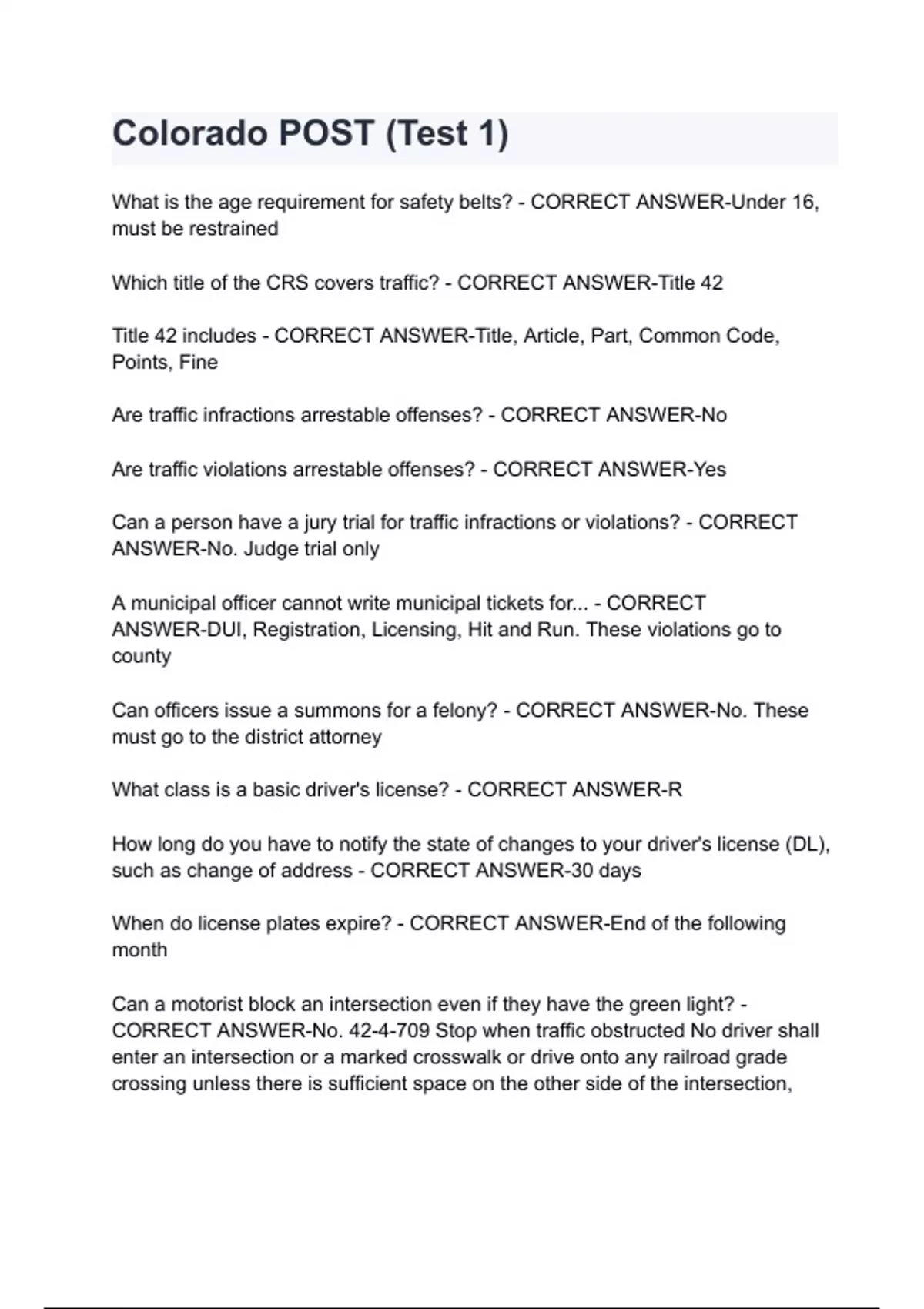 What is the age requirement for safety belts? - CORRECT ANSWER-Under 16, must be restrained Which title of the CRS covers traffic? - CORRECT ANSWER-Title 42 Title 42 includes - CORRECT ANSWER-Title, Article, Part, Common Code, Points, Fine Are traffic infractions arrestable offenses? - CORRECT ANSWER-No Are traffic violations arrestable offenses? - CORRECT ANSWER-Yes Can a person have a jury trial for traffic infractions or violations? - CORRECT ANSWER-No. Judge trial only A municipal officer cannot write municipal tickets for... - CORRECT ANSWER-DUI, Registration, Licensing, Hit and Run. These violations go to county Can officers issue a summons for a felony? - CORRECT ANSWER-No. These must go to the district attorney What class is a basic driver's license? - CORRECT ANSWER-R How long do you have to notify the state of changes to your driver's license (DL), such as change of address - CORRECT ANSWER-30 days When do license plates expire? - CORRECT ANSWER-End of the following month Can a motorist block