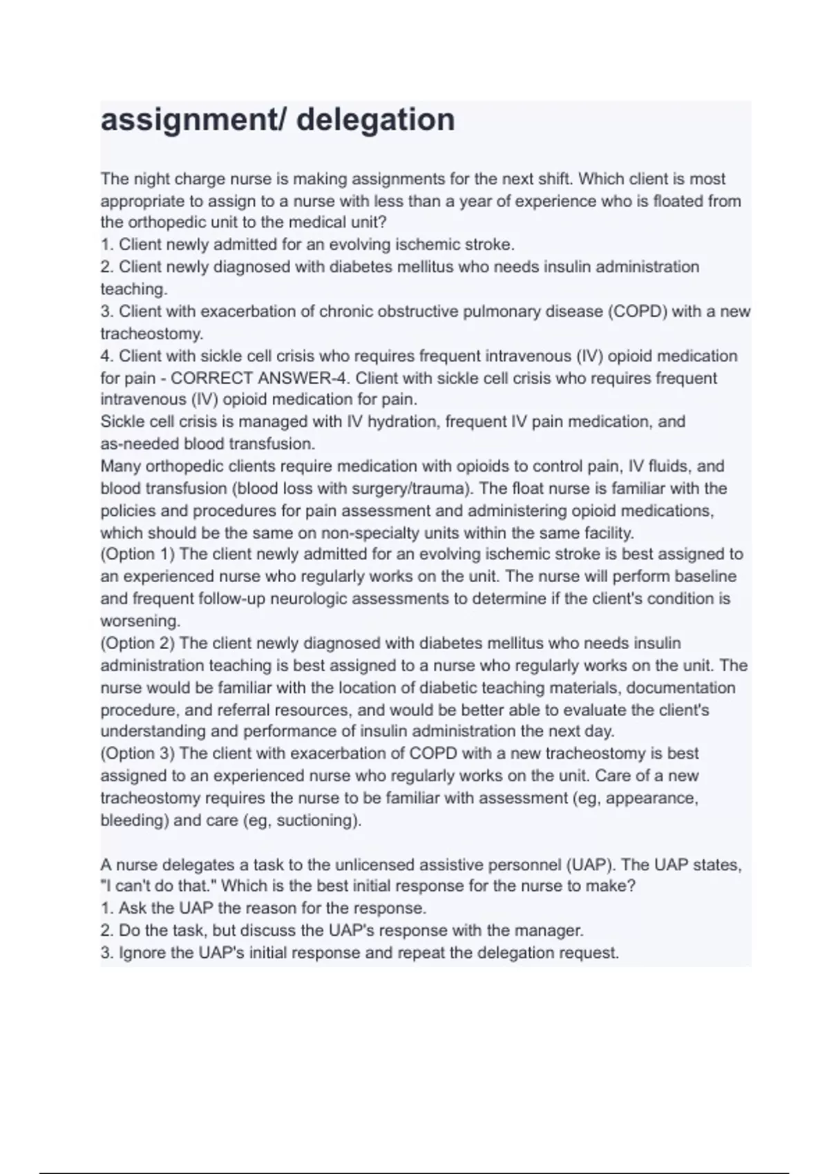 The night charge nurse is making assignments for the next shift. Which client is most appropriate to assign to a nurse with less than a year of experience who is floated from the orthopedic unit to the medical unit? 1. Client newly admitted for an evolving ischemic stroke. 2. Client newly diagnosed with diabetes mellitus who needs insulin administration teaching. 3. Client with exacerbation of chronic obstructive pulmonary disease (COPD) with a new tracheostomy. 4. Client with sickle cell crisis who requires frequent intravenous (IV) opioid medication for pain - CORRECT ANSWER-4. Client with sickle cell crisis who requires frequent intravenous (IV) opioid medication for pain. Sickle cell crisis is managed with IV hydration, frequent IV pain medication, and as-needed blood transfusion. Many orthopedic clients require medication with opioids to control pain, IV fluids, and blood transfusion (blood loss with surgery/trauma). The float nurse is familiar with the policies and procedures for pain assessment and administering opioid medications, which should be the same on non-specialty units within the same facility. (Option 1) The client newly admitted for an evolving ischemic stroke is best assigned to an experienced nurse who regularly works on the unit. The nurse will perform baseline and frequent follow-up neurologic assessments to determine if the client's condition is worsening. (Option 2) The client newly diagnosed with diabetes mellitus who needs insulin administration teaching is best assigned to a nurse who regularly works on the unit. The nurse would be familiar with the location of diabetic teaching materials, documentation procedure, and referral resources, and would be better able to evaluate the client's understanding and performance of insulin administration the next day. (Option 3) The client with exacerbation of COPD with a new tracheostomy is best assigned to an experienced nurse who regularly works on the unit. Care of a new tracheostomy requires