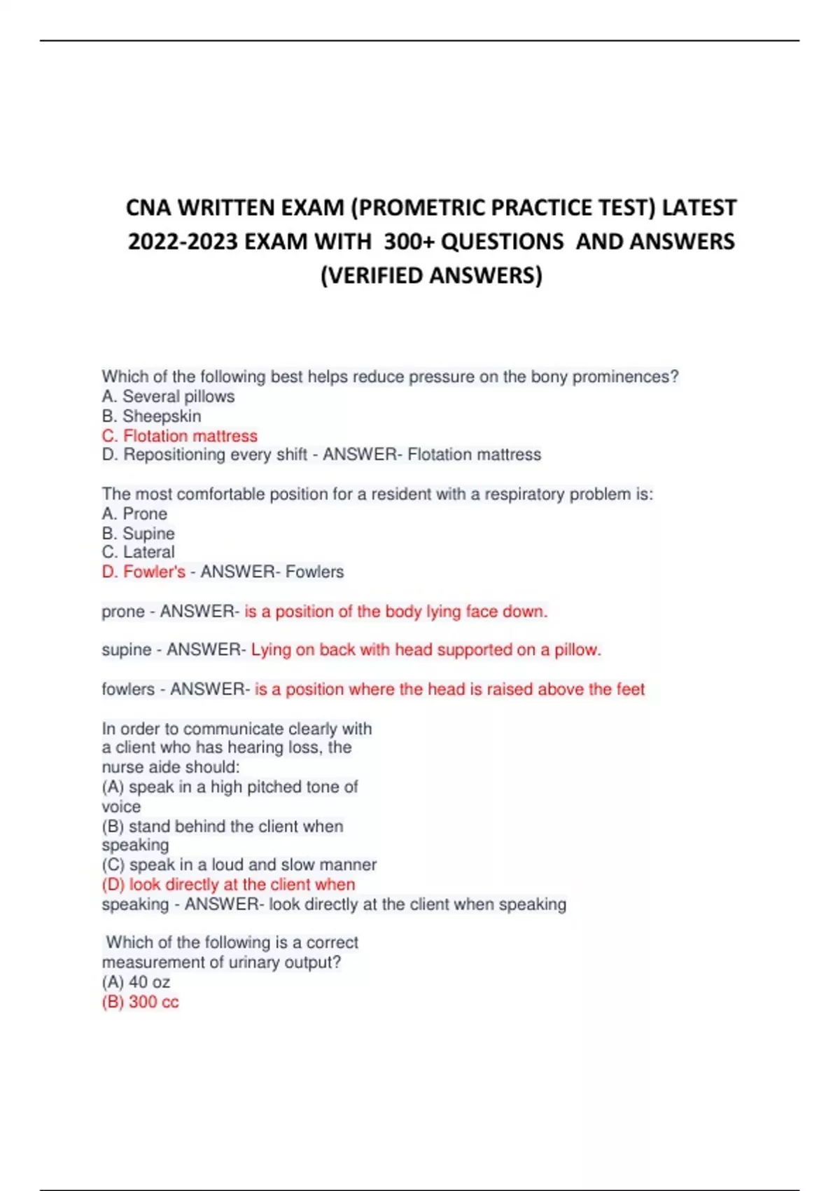 CNA WRITTEN EXAM (PROMETRIC PRACTICE TEST) LATEST EXAM WITH 300+ QUESTIONS AND ANSWERS (VERIFIED ANSWERS)