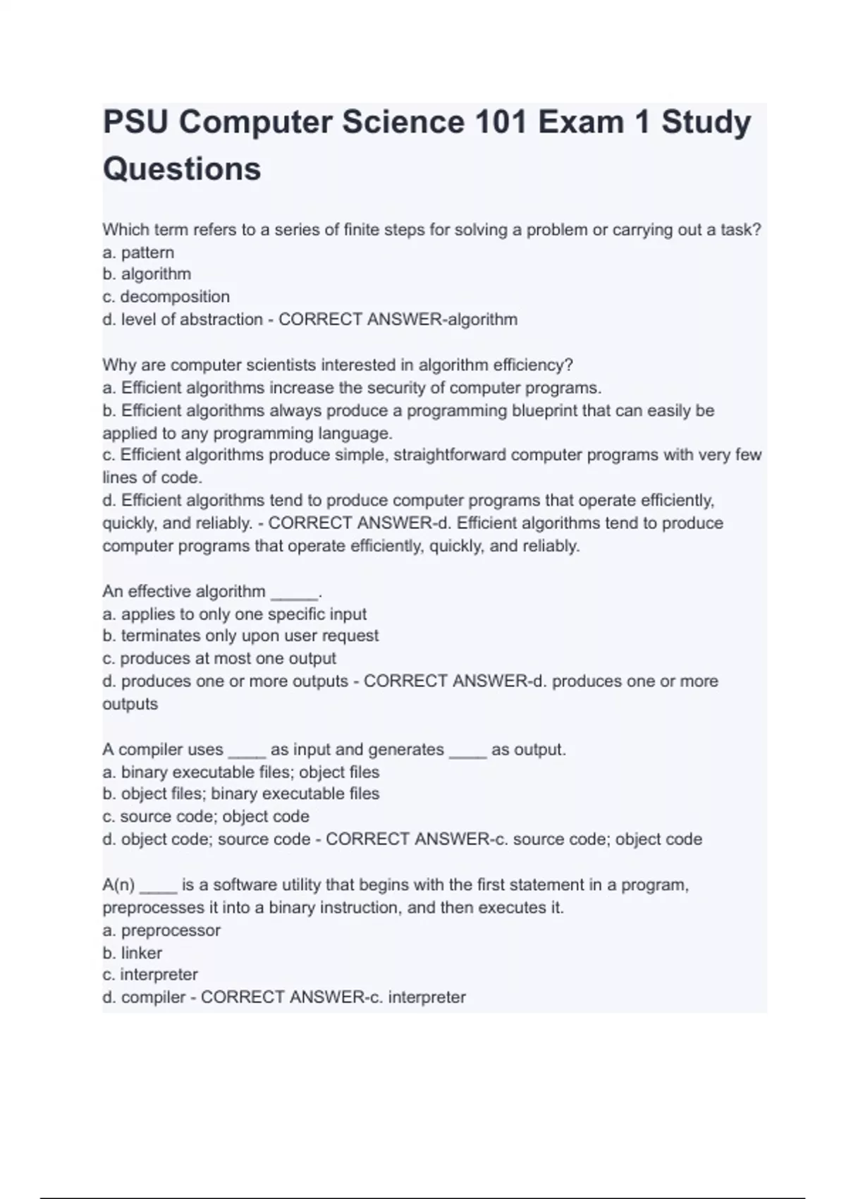 Which term refers to a series of finite steps for solving a problem or carrying out a task? a. pattern b. algorithm c. decomposition d. level of abstraction - CORRECT ANSWER-algorithm Why are computer scientists interested in algorithm efficiency? a. Efficient algorithms increase the security of computer programs. b. Efficient algorithms always produce a programming blueprint that can easily be applied to any programming language. c. Efficient algorithms produce simple, straightforward computer programs with very few lines of code. d. Efficient algorithms tend to produce computer programs that operate efficiently, quickly, and reliably. - CORRECT ANSWER-d. Efficient algorithms tend to produce computer programs that operate efficiently, quickly, and reliably. An effective algorithm _____. a. applies to only one specific input b. terminates only upon user request c. produces at most one output d. produces one or more outputs - CORRECT ANSWER-d. produces one or more outputs A compiler uses ____ as input and generates ____ as output. a. binary executable files; object files b. object files; binary executable files c. source code; object code d. object code; source code - CORRECT ANSWER-c. source code; object code A(n) ____ is a software ut