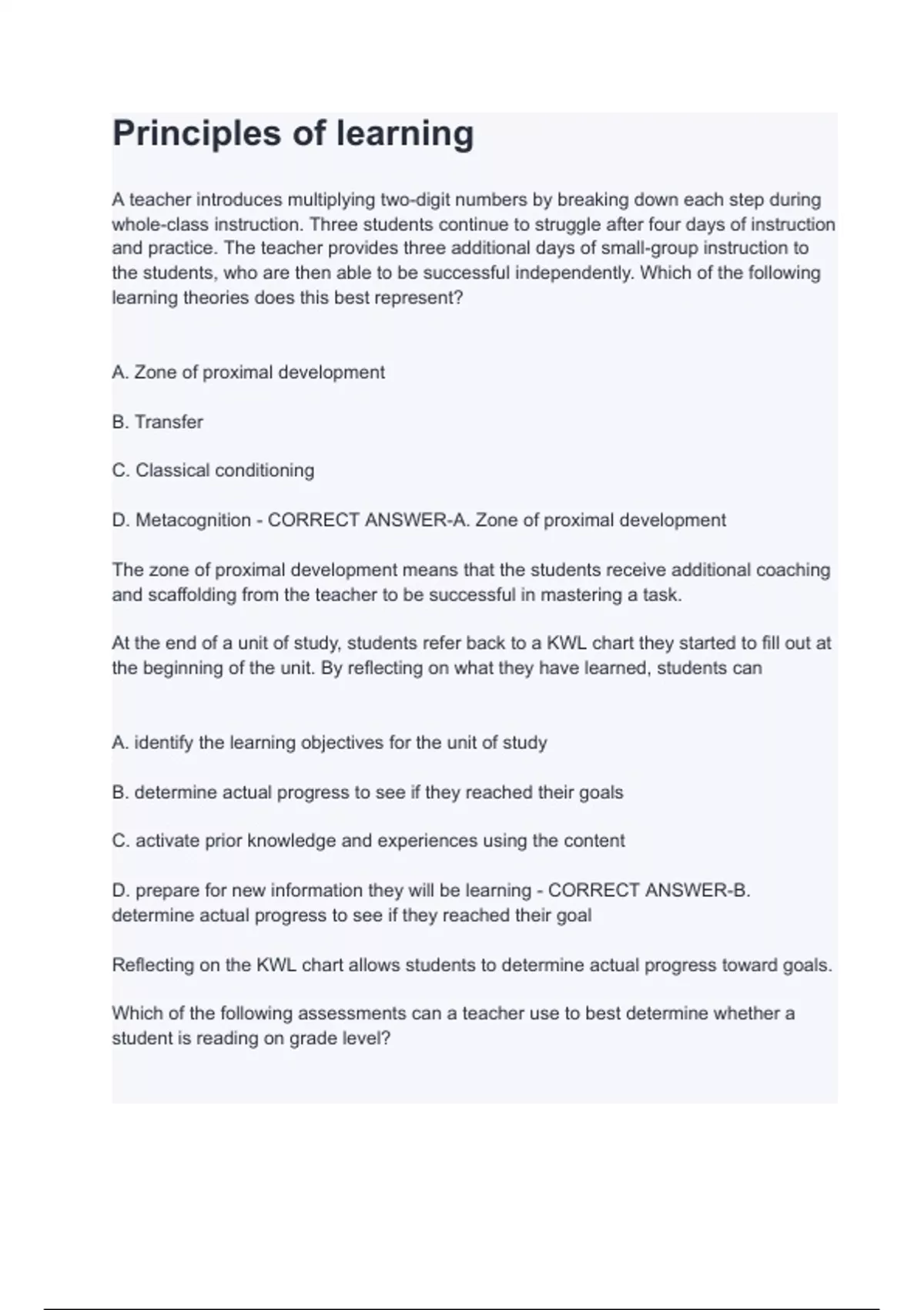 A teacher introduces multiplying two-digit numbers by breaking down each step during whole-class instruction. Three students continue to struggle after four days of instruction and practice. The teacher provides three additional days of small-group instruction to the students, who are then able to be successful independently. Which of the following learning theories does this best represent? A. Zone of proximal development B. Transfer C. Classical conditioning D. Metacognition - CORRECT ANSWER-A. Zone of proximal development The zone of proximal development means that the students receive additional coaching and scaffolding from the teacher to be successful in mastering a task. At the end of a unit of study, students refer back to a KWL chart they started to fill out at the beginning of the unit. By reflecting on what they have learned, students can A. identify the learning objectives for the unit of study B. determine actual progress to see if they reached their goals C. activate prior knowledge and experiences using the content D. prepare for new information they will be learning - CORRECT ANSWER-B. determine actual progress to see if they reached their goal Reflecting on the KWL chart allow