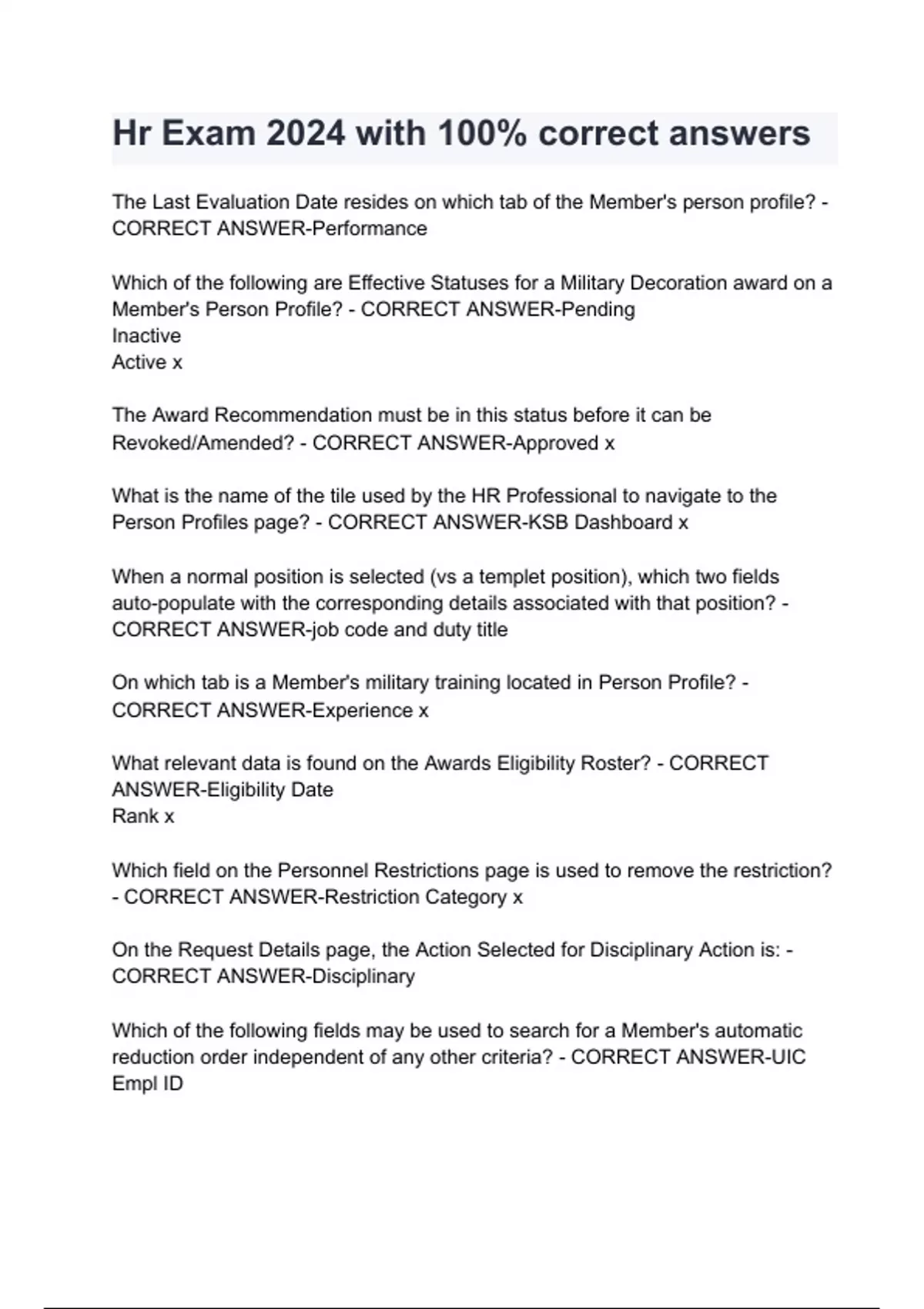 The Last Evaluation Date resides on which tab of the Member's person profile? - CORRECT ANSWER-Performance Which of the following are Effective Statuses for a Military Decoration award on a Member's Person Profile? - CORRECT ANSWER-Pending Inactive Active x The Award Recommendation must be in this status before it can be Revoked/Amended? - CORRECT ANSWER-Approved x What is the name of the tile used by the HR Professional to navigate to the Person Profiles page? - CORRECT ANSWER-KSB Dashboard x When a normal position is selected (vs a templet position), which two fields auto-populate with the corresponding details associated with that position? - CORRECT ANSWER-job code and duty title On which tab is a Member's military training located in Person Profile? - CORRECT ANSWER-Experience x What relevant data is found on the Awards Eligibility Roster? - CORRECT ANSWER-Eligibility Date Rank x Which field on the Personnel Restrictions page is used to remove the restriction? - CORRECT ANSWER-Restriction Category x On the Request Details page, the Action Selected for Disciplinary Action is: - CORRECT ANSWER-Disciplinary Which of the following fields
