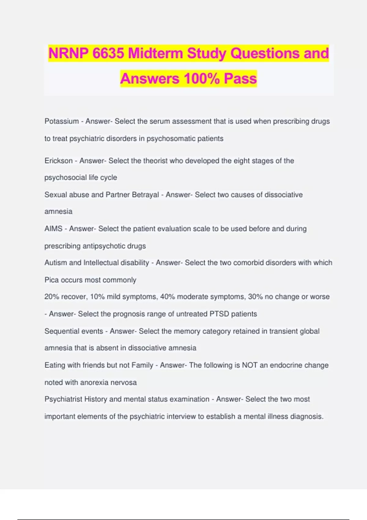 NRNP 6635 Midterm Study Questions and Answers 100% Pass Potassium - Answer- Select the serum assessment that is used when prescribing drugs to treat psychiatric disorders in psychosomatic patients Erickson - Answer- Select the theorist who developed the eight stages of the psychosocial life cycle Sexual abuse and Partner Betrayal - Answer- Select two causes of dissociative amnesia AIMS - Answer- Select the patient evaluation scale to be used before and during prescribing antipsychotic drugs Autism and Intellectual disability - Answer- Select the two comorbid disorders with which Pica occurs most commonly 20% recover, 10% mild symptoms, 40% moderate symptoms, 30% no change or worse - Answer- Select the prognosis range of untreated PTSD patients Sequential events - Answer- Select the memory category retained in transient global amnesia that is absent in dissociative amnesia Eating with friends but not Family - Answer- The following is NOT an endocrine change noted with anorexia nervosa Psychiatrist History and mental status examination - Answer- Select the two most important elements of the psychiatric interview to establish a mental illness diagnosis. Patient Resistance - Answer- Select the greatest impediment to treat anorexia nervosa patients. Central Apnea - Answer- Select the sleep disorder in which cataplexy is a common symptom Hoarding - Answer- Select the obsessive-compulsive disorder for which a patient is likely to initially seek help from a Primary Care Provider CAPS - Answer- Select the rating scale used to assess obsessive-compulsive disorder 4 - Answer- Select age after which encopresis may be correctly diagnosed Dysthymia - Answer- Select the mood disorder that is worsened by chronic exposure to observing violence in television, movies, and video games Medical history - Answer- Select a provider's most important knowledge area essential to a successful mental health interview of a child 6-8 weeks - Answer- Select the minimum treatment time to assess the effectiveness of antidepressant drug therapy PTSD has recurrent, distressing dreams - Answer- What is one main difference between acute stress disorder and PTSD? Short duration of symptoms - Answer- Factors that indicate a good prognosis for PTSD disorders include all the following EXCEPT: Angina Pectoris - Answer- Select the medical condition that must be excluded as a cause of somatic symptom disorder or hypochondriasis Appetite - Answer- What is the most IMMEDIATE consideration in assessing depression in adolescents?