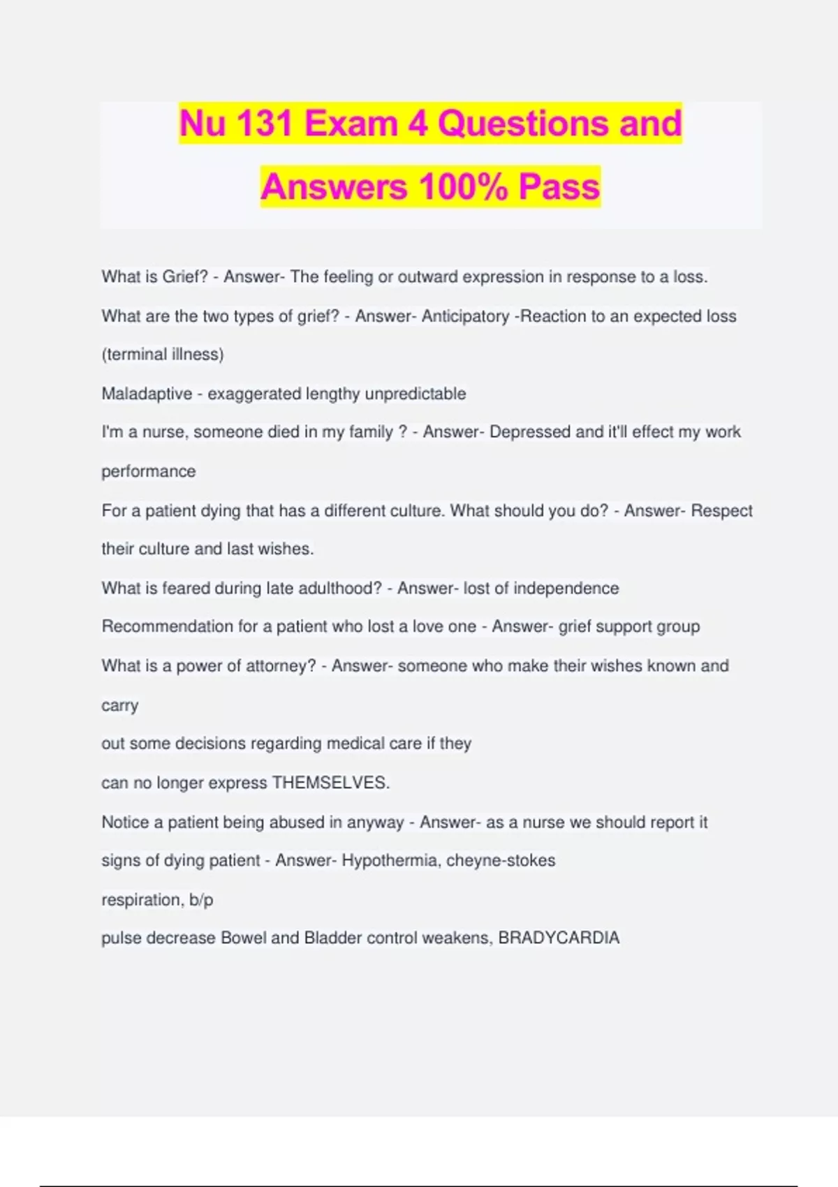 Nu 131 Exam 4 Questions and Answers 100% Pass What is Grief? - Answer- The feeling or outward expression in response to a loss. What are the two types of grief? - Answer- Anticipatory -Reaction to an expected loss (terminal illness) Maladaptive - exaggerated lengthy unpredictable I'm a nurse, someone died in my family ? - Answer- Depressed and it'll effect my work performance For a patient dying that has a different culture. What should you do? - Answer- Respect their culture and last wishes. What is feared during late adulthood? - Answer- lost of independence Recommendation for a patient who lost a love one - Answer- grief support group What is a power of attorney? - Answer- someone who make their wishes known and carry out some decisions regarding medical care if they can no longer express THEMSELVES. Notice a patient being abused in anyway - Answer- as a nurse we should report it signs of dying patient - Answer- Hypothermia, cheyne-stokes respiration, b/p pulse decrease Bowel and Bladder control weakens, BRADYCARDIA Hospice care - Answer- terminally ill, 6 months to live, comfort =, no treatment necessary Palliative care - Answer- terminally ill but still receives car/ treatment How does a school age child feels when they loss their sibling? - Answer- they try to understand or make sense of it. what is the correct process of aging? - Answer- Anger phase - Answer- screaming and blaming (It's not fair ) adolescence physical changes - Answer- menstruation, breast development, girls (rapid growth 10-11) secondary characteristics- armpit odor Psychosocial of young adulthood - Answer- (20-40) Intimacy vs Isolation Work is major role for this group What is a local school screening for adolescent? - Answer- Scoliosis How many hours of sleep does middle adulthood need ? - Answer- 7-9 hours How many hours of sleep does late adulthood need ? - Answer- 7-9 hours (they can experience insomnia, they should also avoid large heavy meals before bed and avoid smoking Puberty in girls - Answer- Rapid growth (10-11) and pubic hair growth What are some common problems during young adulthood? - Answer- Heart disease, increase of high cholesterol and hypertension Young adults during Intimacy - Answer- Reliable