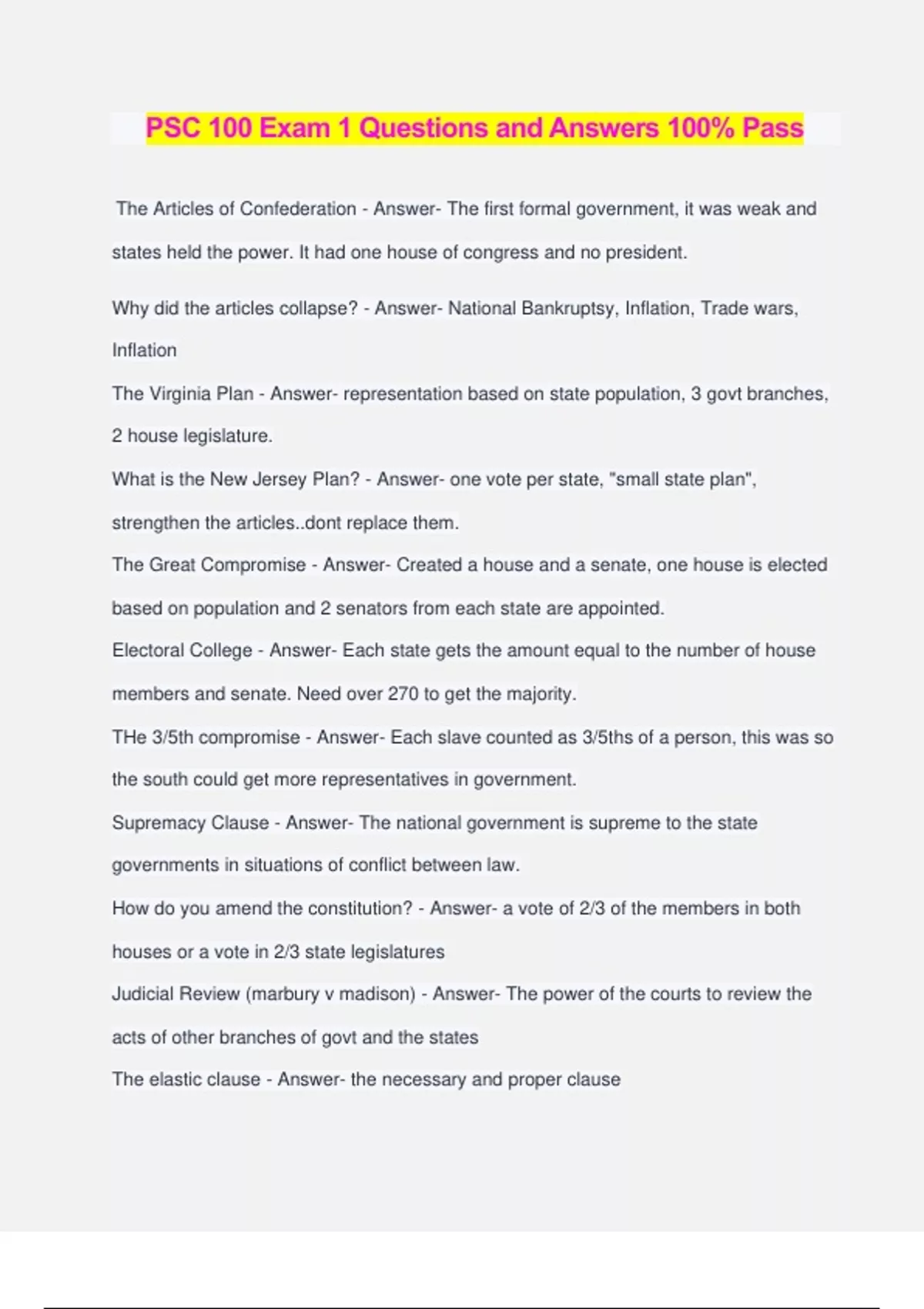 PSC 100 Exam 1 Questions and Answers 100% Pass The Articles of Confederation - Answer- The first formal government, it was weak and states held the power. It had one house of congress and no president. Why did the articles collapse? - Answer- National Bankruptsy, Inflation, Trade wars, Inflation The Virginia Plan - Answer- representation based on state population, 3 govt branches, 2 house legislature. What is the New Jersey Plan? - Answer- one vote per state, "small state plan", strengthen the articles..dont replace them. The Great Compromise - Answer- Created a house and a senate, one house is elected based on population and 2 senators from each state are appointed. Electoral College - Answer- Each state gets the amount equal to the number of house members and senate. Need over 270 to get the majority. THe 3/5th compromise - Answer- Each slave counted as 3/5ths of a person, this was so the south could get more representatives in government. Supremacy Clause - Answer- The national government is supreme to the state governments in situations of conflict between law. How do you amend the constitution? - Answer- a vote of 2/3 of the members in both houses or a vote in 2/3 state legislatures Judicial Review (marbury v madison) - Answer- The power of the courts to review the acts of other branches of govt and the states The elastic clause - Answer- the necessary and proper clause