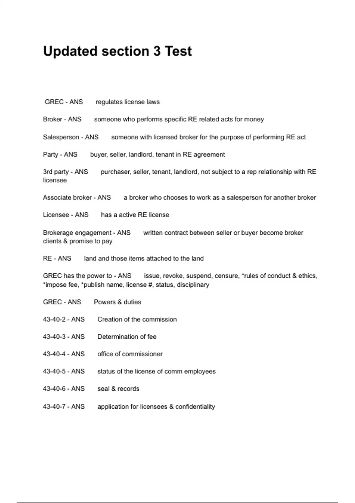 GREC - ANS regulates license laws Broker - ANS someone who performs specific RE related acts for money Salesperson - ANS someone with licensed broker for the purpose of performing RE act Party - ANS buyer, seller, landlord, tenant in RE agreement 3rd party - ANS purchaser, seller, tenant, landlord, not subject to a rep relationship with RE licensee Associate broker - ANS a broker who chooses to work as a salesperson for another broker Licensee - ANS has a active RE license Brokerage engagement - ANS written contract between seller or buyer become broker clients & promise to pay RE - ANS land and those items attached to the land GREC has the power to - ANS issue, revoke, suspend, censure, *rules of conduct & ethics, *impose fee, *publish name, license #, status, disciplinary GREC - ANS Powers & duties 43-40-2 - ANS Creation of the commission 43-40-3 - ANS Determination of fee 43-40-4 - ANS office of commissioner 43-40-5 - ANS status of the license of comm employees 43-40-6 - ANS seal & records