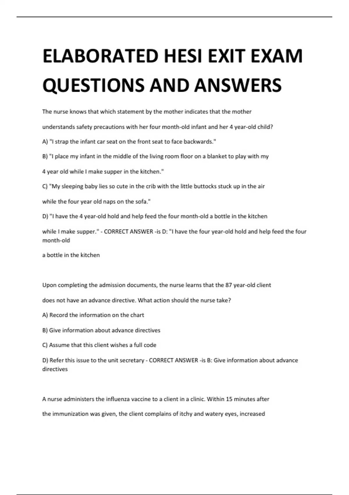 ELABORATED HESI EXIT EXAM QUESTIONS AND ANSWERS The nurse knows that which statement by the mother indicates that the mother understands safety precautions with her four month-old infant and her 4 year-old child? A) "I strap the infant car seat on the front seat to face backwards." B) "I place my infant in the middle of the living room floor on a blanket to play with my 4 year old while I make supper in the kitchen." C) "My sleeping baby lies so cute in the crib with the little buttocks stuck up in the air while the four year old naps on the sofa." D) "I have the 4 year-old hold and help feed the four month-old a bottle in the kitchen while I make supper." - CORRECT ANSWER -is D: "I have the four year-old hold and help feed the four month-old a bottle in the kitchen Upon completing the admission documents, the nurse learns that the 87 year-old client does not have an advance directive. What action should the nurse take? A) Record the information on the chart B) Give information about advance directives C) Assume that this client wishes a full code D) Refer this issue to the unit secretary - CORRECT ANSWER -is B: Give information about advance directives A nurse administers the influenza vaccine to a client in a clinic. Within 15 minutes after the immunization was given, the client complains of itchy and watery eyes, increased anxiety, and difficulty breathing. The nurse expects that the first action in the sequence of care for this client will be to A) Maintain the airway B) Administer epinephrine 1:1000 as ordered C) Monitor for hypotension with shock D) Administer diphenhydramine as ordered - CORRECT ANSWER -is B: Administer epinephrine 1:1000 as ordered . Which of these children at the site of a disaster at a child day care center would the triage nurse put in the "treat last" category? A) An infant with intermittent bulging anterior fontanel between crying episodes B) A toddler with severe deep abrasions over 98% of the body C) A preschooler with 1 lower leg fracture and the other leg with an upper leg fracture D) A school-age child with singed eyebrows and hair on the arms - CORRECT ANSWER -is B: A toddler with severe deep abrasions over 98% of the body . When admitting a client to an acute care facility, an identification bracelet is sent up with the admission form. In the event these do not match, the nurse's best action is to A) Change whichever item is incorrect to the correct information B) Use the bracelet and admission form until a replacement is supplied C) Notify the admissions office and wait to apply the bracelet D) Make a corrected identification bracelet for the client - CORRECT ANSWER -is C: notify the admissions office and wait to apply the bracelet The nurse is having difficulty reading the health care provider's written order that was written right before the shift change. What action should be taken? A) Leave the order for the oncoming staff to follow-up