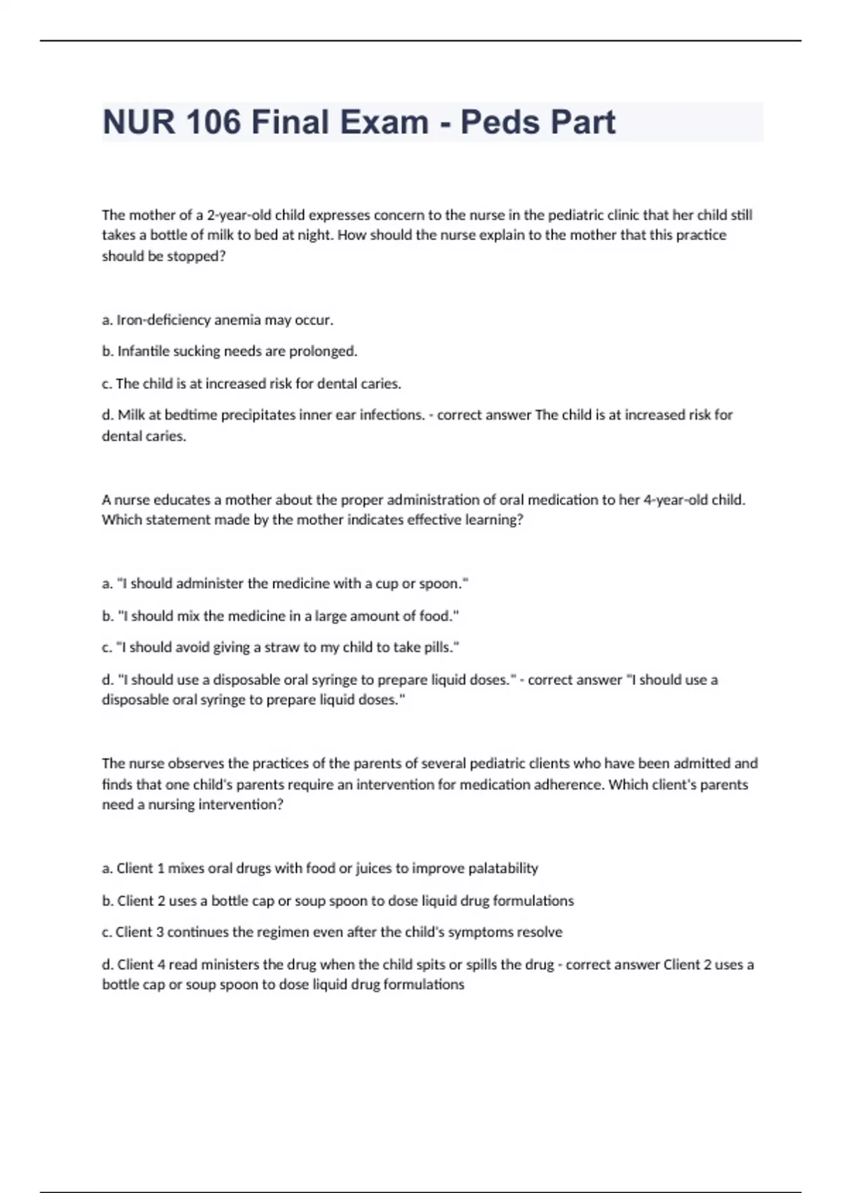 NUR 106 Final Exam - Peds Part Study Guide Test Questions 2024. The mother of a 2-year-old child expresses concern to the nurse in the pediatric clinic that her child still takes a bottle of milk to bed at night. How should the nurse explain to the mother that this practice should be stopped? a. Iron-deficiency anemia may occur. b. Infantile sucking needs are prolonged. c. The child is at increased risk for dental caries. d. Milk at bedtime precipitates inner ear infections. - correct answer The child is at increased risk for dental caries. A nurse educates a mother about the proper administration of oral medication to her 4-year-old child. Which statement made by the mother indicates effective learning? a. "I should administer the medicine with a cup or spoon." b. "I should mix the medicine in a large amount of food." c. "I should avoid giving a straw to my child to take pills." d. "I should use a disposable oral syringe to prepare liquid doses." - correct answer "I should use a disposable oral syringe to prepare liquid doses." The nurse observes the practices of the parents of several pediatric clients who have been admitted and finds that one child's parents require an intervention for medication adherence. Which client's parents need a nursing intervention? a. Client 1 mixes oral drugs with food or juices to improve palatability b. Client 2 uses a bottle cap or soup spoon to dose liquid drug formulations c. Client 3 continues the regimen even after the child's symptoms resolve d. Client 4 read ministers the drug when the child spits or spills the drug - correct answer Client 2 uses a bottle cap or soup spoon to dose liquid drug formulations
