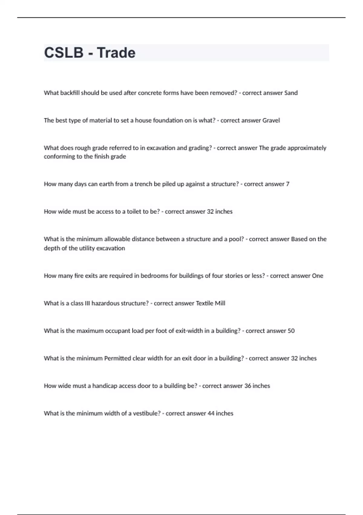 CSLB - TradeWhat backfill should be used after concrete forms have been removed? - correct answer Sand The best type of material to set a house foundation on is what? - correct answer Gravel What does rough grade referred to in excavation and grading? - correct answer The grade approximately conforming to the finish grade How many days can earth from a trench be piled up against a structure? - correct answer 7 How wide must be access to a toilet to be? - correct answer 32 inches What is the minimum allowable distance between a structure and a pool? - correct answer Based on the depth of the utility excavation How many fire exits are required in bedrooms for buildings of four stories or less? - correct answer One What is a class III hazardous structure? - correct answer Textile Mill What is the maximum occupant load per foot of exit-width in a building? - correct answer 50 What is the minimum Permitted clear width for an exit door in a building? - correct answer 32 inches How wide must a handicap access door to a building be? - correct answer 36 inches What is the minimum width of a vestibule? - correct answer 44 inches