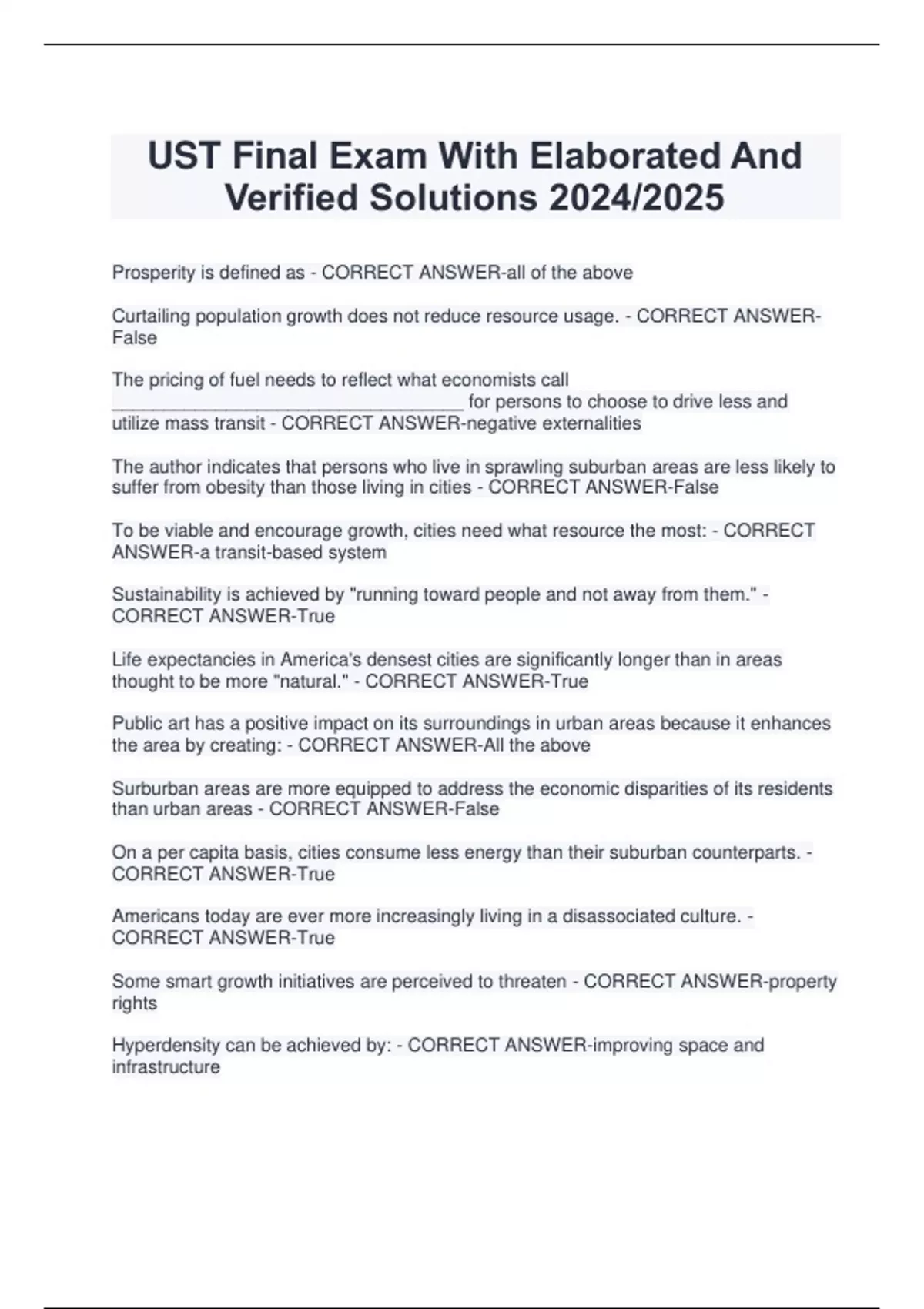 UST Final Exam With Elaborated And Verified Solutions 2024/2025 Prosperity is defined as - CORRECT ANSWER-all of the above Curtailing population growth does not reduce resource usage. - CORRECT ANSWERFalse The pricing of fuel needs to reflect what economists call __________________________________ for persons to choose to drive less and utilize mass transit - CORRECT ANSWER-negative externalities The author indicates that persons who live in sprawling suburban areas are less likely to suffer from obesity than those living in cities - CORRECT ANSWER-False To be viable and encourage growth, cities need what resource the most: - CORRECT ANSWER-a transit-based system Sustainability is achieved by "running toward people and not away from them." - CORRECT ANSWER-True Life expectancies in America's densest cities are significantly longer than in areas thought to be more "natural." - CORRECT ANSWER-True Public art has a positive impact on its surroundings in urban areas because it enhances the area by creating: - CORRECT ANSWER-All the above Surburban areas are more equipped to address the economic disparities of its residents than urban areas - CORRECT ANSWER-False On a per capita basis, cities consume less energy than their suburban counterparts. - CORRECT ANSWER-True Americans today are ever more increasingly living in a disassociated culture. - CORRECT ANSWER-True Some smart growth initiatives are perceived to threaten - CORRECT ANSWER-property rights Hyperdensity can be achieved by: - CORRECT ANSWER-improving space and infrastructure