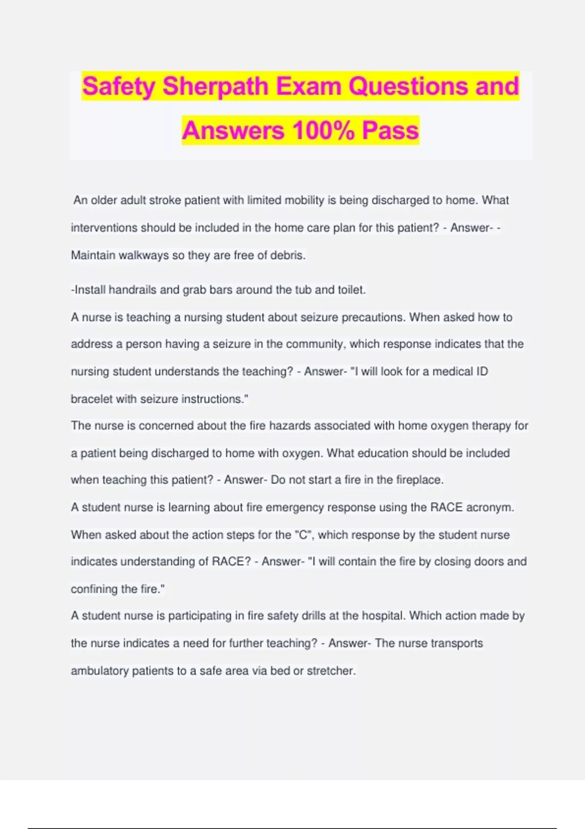 Safety Sherpath Exam Questions and Answers 100% Pass An older adult stroke patient with limited mobility is being discharged to home. What interventions should be included in the home care plan for this patient? - Answer- - Maintain walkways so they are free of debris. -Install handrails and grab bars around the tub and toilet. A nurse is teaching a nursing student about seizure precautions. When asked how to address a person having a seizure in the community, which response indicates that the nursing student understands the teaching? - Answer- "I will look for a medical ID bracelet with seizure instructions." The nurse is concerned about the fire hazards associated with home oxygen therapy for a patient being discharged to home with oxygen. What education should be included when teaching this patient? - Answer- Do not start a fire in the fireplace. A student nurse is learning about fire emergency response using the RACE acronym. When asked about the action steps for the "C", which response by the student nurse indicates understanding of RACE? - Answer- "I will contain the fire by closing doors and confining the fire." A student nurse is participating in fire safety drills at the hospital. Which action made by the nurse indicates a need for further teaching? - Answer- The nurse transports ambulatory patients to a safe area via bed or stretcher.