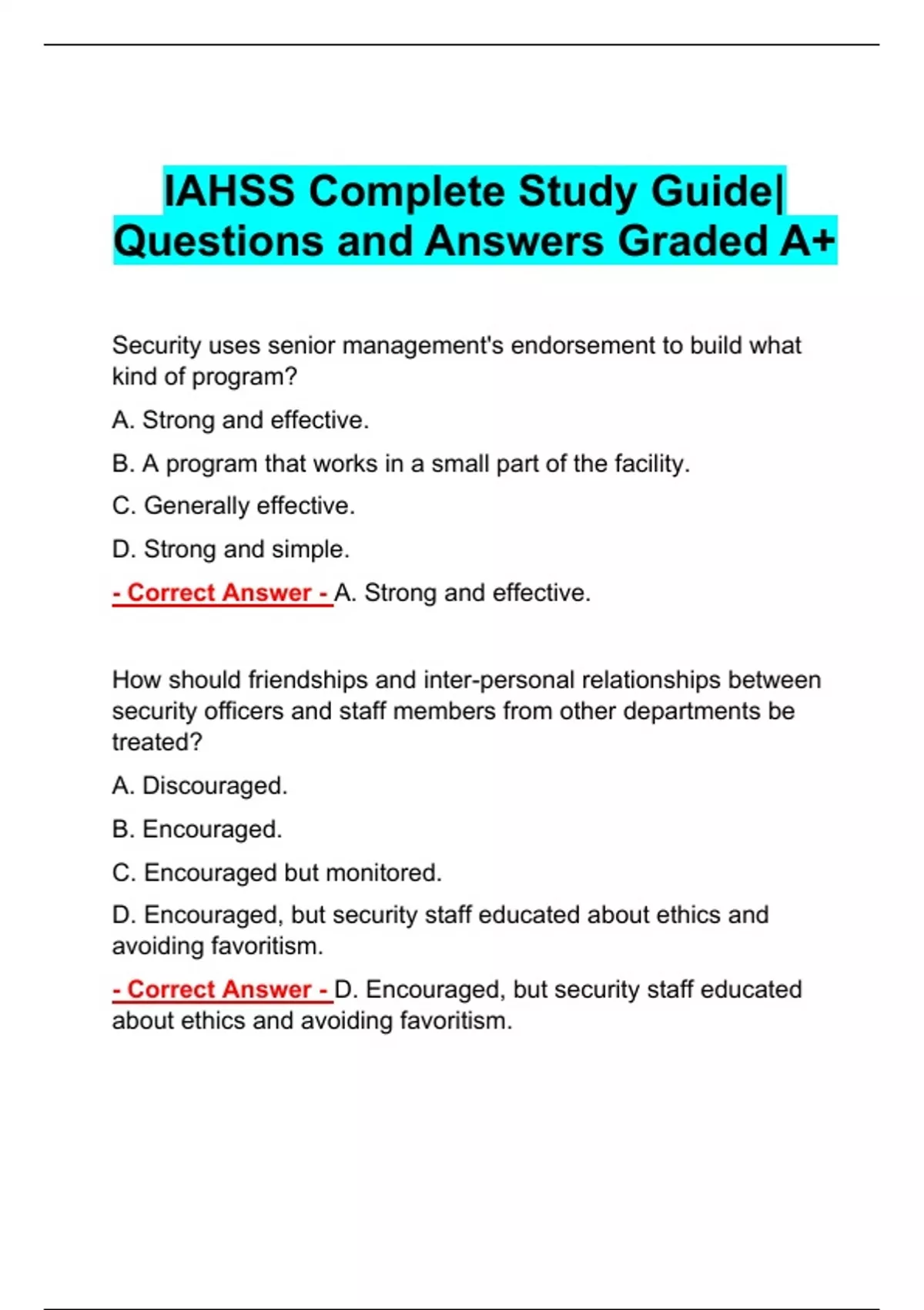 BUNDLE for IAHSS Advanced Exam Study Guide Latest 2024 | Download to Score A+ | IAHSS Basic Officer Certification Exam Questions and Answers 2024