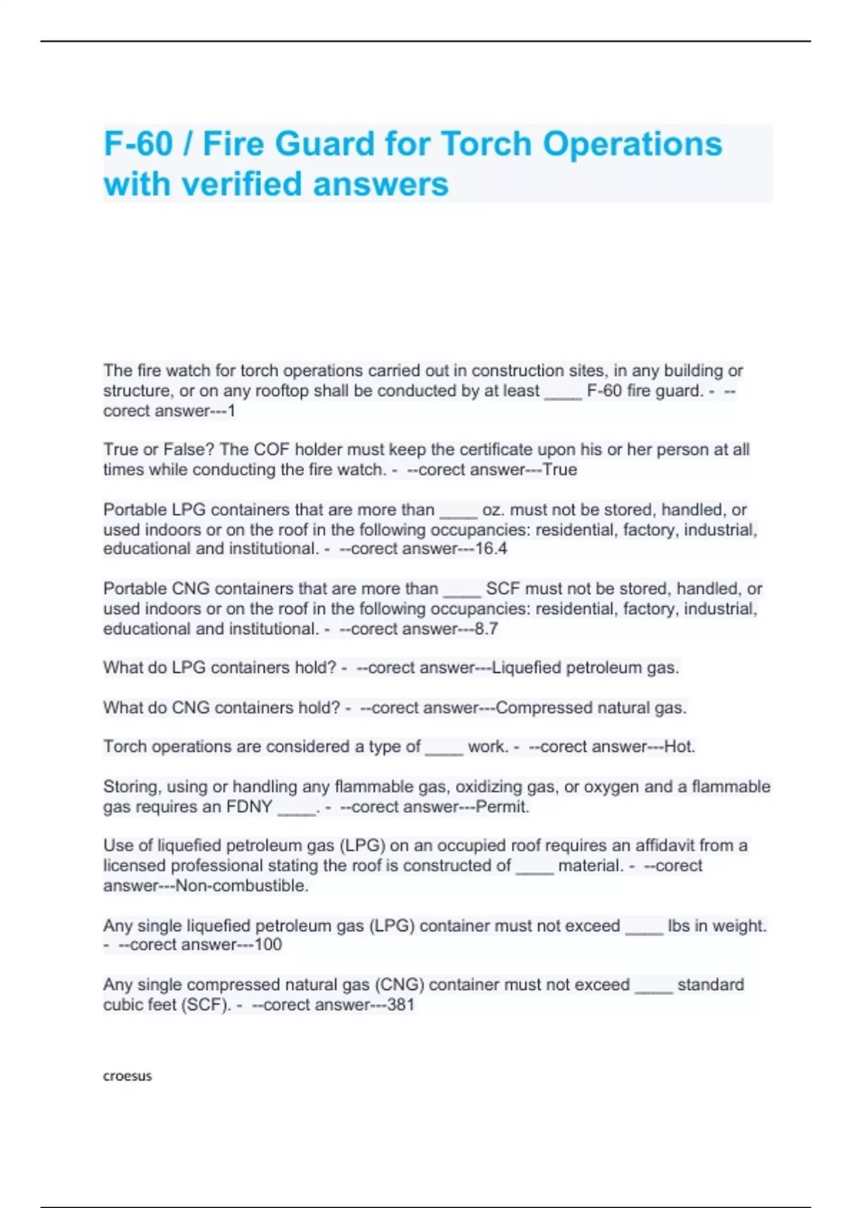The fire watch for torch operations carried out in construction sites, in any building or structure, or on any rooftop shall be conducted by at least ____ F-60 fire guard. - --corect answer---1 True or False? The COF holder must keep the certificate upon his or her person at all times while conducting the fire watch. - --corect answer---True Portable LPG containers that are more than ____ oz. must not be stored, handled, or used indoors or on the roof in the following occupancies: residential, factory, industrial, educational and institutional. - --corect answer---16.4 Portable CNG containers that are more than ____ SCF must not be stored, handled, or used indoors or on the roof in the following occupancies: residential, factory, industrial, educational and institutional. - --corect answer---8.7 What do LPG containers hold? - --corect answer---Liquefied petroleum gas. What do CNG containers hold? - --corect answer---Compressed natural gas. Torch operations are considered a type of ____ work. - --corect answer---Hot. Storing, using or handling any flammable gas, oxidizing gas, or oxygen and a flammable gas requires an FDNY ____. - --corect answer---Permit. Use of liquefied petroleum gas (LPG) on an occupied roof requires an affidavit from a licensed professional stating the roof is constructed of ____ material. - --corect answer---Non-combustible. Any single liquefied petroleum gas (LPG) container must not exceed ____ lbs in weight. - --corect answer---100 Any single compressed natural gas (CNG) container must not exceed ____ standard cubic feet (SCF). - --corect answer---381