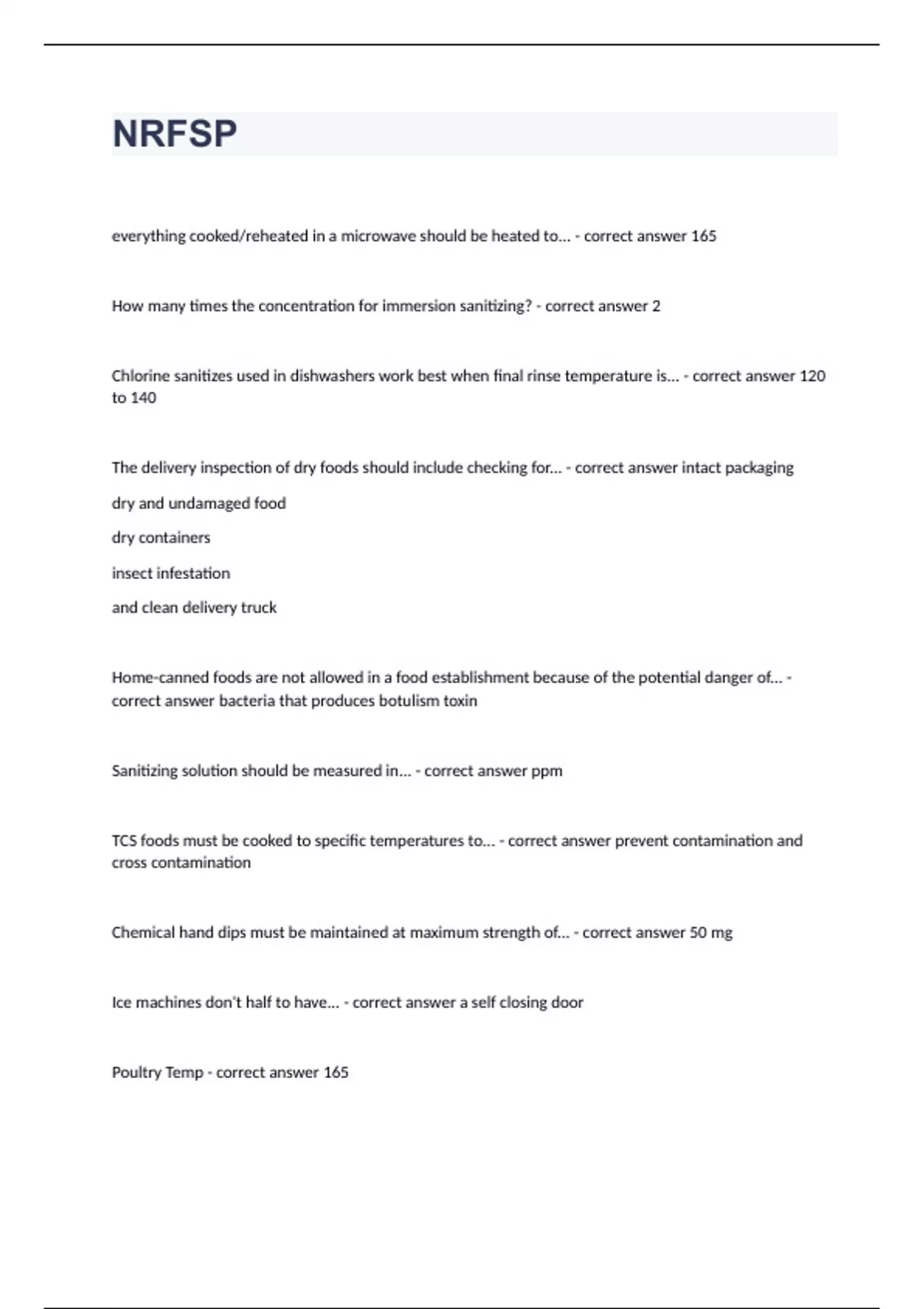 NRFSPeverything cooked/reheated in a microwave should be heated to... - correct answer 165 How many times the concentration for immersion sanitizing? - correct answer 2 Chlorine sanitizes used in dishwashers work best when final rinse temperature is... - correct answer 120 to 140 The delivery inspection of dry foods should include checking for... - correct answer intact packaging dry and undamaged food dry containers insect infestation and clean delivery truck Home-canned foods are not allowed in a food establishment because of the potential danger of... - correct answer bacteria that produces botulism toxin Sanitizing solution should be measured in... - correct answer ppm TCS foods must be cooked to specific temperatures to... - correct answer prevent contamination and cross contamination Chemical hand dips must be maintained at maximum strength of... - correct answer 50 mg Ice machines don't half to have... - correct answer a self closing door Poultry Temp - correct answer 165