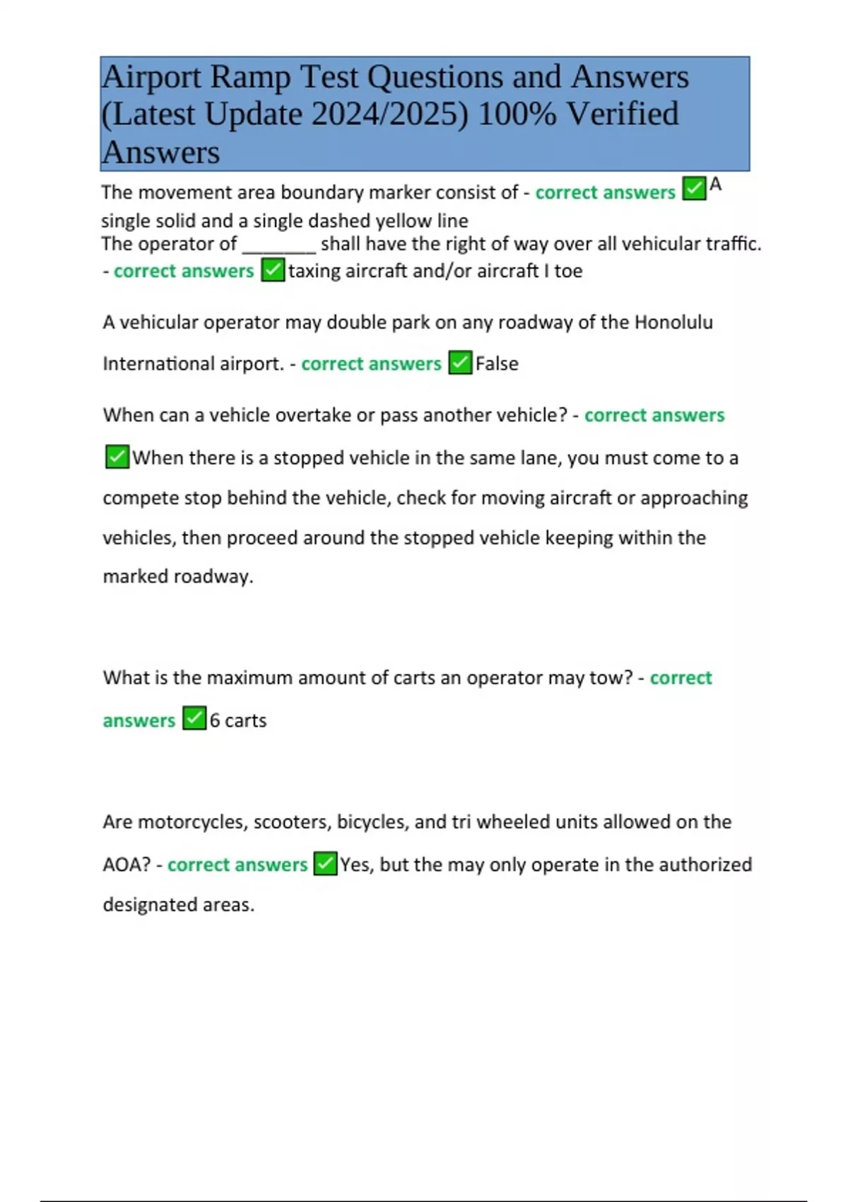 Airport Ramp Test Questions and Answers Latest Update 2024/2025 | 100% Verified Answers. The movement area boundary marker consist of - correct answers A single solid and a single dashed yellow line The operator of _______ shall have the right of way over all vehicular traffic. - correct answers taxing aircraft and/or aircraft I toe A vehicular operator may double park on any roadway of the Honolulu International airport. - correct answers False When can a vehicle overtake or pass another vehicle? - correct answers When there is a stopped vehicle in the same lane, you must come to a compete stop behind the vehicle, check for moving aircraft or approaching vehicles, then proceed around the stopped vehicle keeping within the marked roadway. What is the maximum amount of carts an operator may tow? - correct answers 6 carts Are motorcycles, scooters, bicycles, and tri wheeled units allowed on the AOA? - correct answers Yes, but the may only operate in the authorized designated areas. Airport Ramp Test Questions and Answers (Latest Update 2024/2025) 100% Verified Answers Airport Ramp Test Questions and Answers (Latest Update 2023) Verified Answers Fuel trucks should park atleast _______ from any airport terminal building, aircraft cargo building, aircraft hanger, or other structures housing the public which has windows or doors in the exposed walls. - correct answers 50 feet No operator shall park within _______ of a fire hydrant - correct answers 15 feet In the event of accidental fuel spill - correct answers All vehicles within 100 feet of the spill must come to an immediate halt When an aircraft is parked in an operational area at a loading position, the space between the aircraft and the concourse or terminal building shall not be used as a vehicular route, Except - correct answers By vehicles servicing that aircraft What is the purpose of a road guard on the AOA? - correct answers To provide safe movement for aircraft being pushed back from a gate Airport Ramp Test Questions and Answers (Latest Update 2023) Verified Answers Slowing moving vehicles must be equipped with a _______. - correct answers Both A and B A. Triangular slowing moving vehicle emblem B. Flashing Amber light What is the speed limit on the marked roadway? - correct answers 20 MPH Ramp license shall be automatically suspended or revoked upon suspension or revocation of the persons state or municipal motor vehicle license. - correct answers True Whenever an aircraft turns off the taxiway and onto the parking position lead in line, all vehicles approaching the same position - correct answers Shall stop and give way to the aircraf
