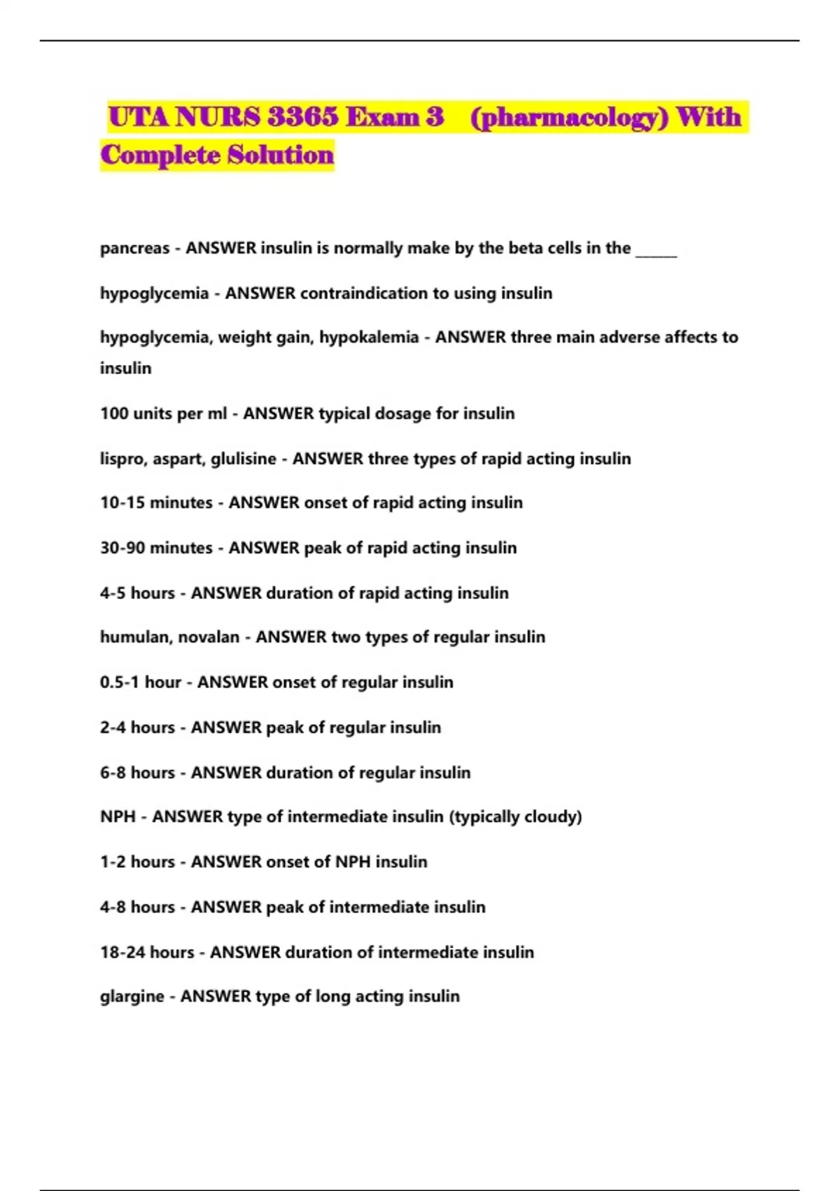 pancreas - ANSWER insulin is normally make by the beta cells in the ______ hypoglycemia - ANSWER contraindication to using insulin hypoglycemia, weight gain, hypokalemia - ANSWER three main adverse affects to insulin 100 units per ml - ANSWER typical dosage for insulin lispro, aspart, glulisine - ANSWER three types of rapid acting insulin 10-15 minutes - ANSWER onset of rapid acting insulin 30-90 minutes - ANSWER peak of rapid acting insulin 4-5 hours - ANSWER duration of rapid acting insulin humulan, novalan - ANSWER two types of regular insulin 0.5-1 hour - ANSWER onset of regular insulin 2-4 hours - ANSWER peak of regular insulin 6-8 hours - ANSWER duration of regular insulin NPH - ANSWER type of intermediate insulin (typically cloudy) 1-2 hours - ANSWER onset of NPH insulin 4-8 hours - ANSWER peak of intermediate insulin 18-24 hours - ANSWER duration of intermediate insulin glargine - ANSWER type of long acting insulin1 hour - ANSWER onset of long acting insulin none - ANSWER peak of long acting insulin 24+ hours - ANSWER duration of long acting insulin hypoglycemia - ANSWER S&S of _______: confusion, irritabili