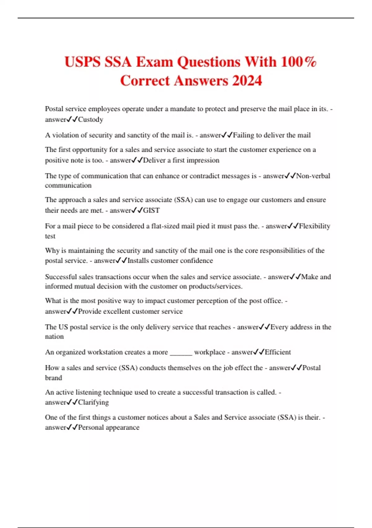 USPS SSA Exam Questions With 100% Correct Answers 2024 Postal service employees operate under a mandate to protect and preserve the mail place in its. - answerCustody A violation of security and sanctity of the mail is. - answerFailing to deliver the mail The first opportunity for a sales and service associate to start the customer experience on a positive note is too. - answerDeliver a first impression The type of communication that can enhance or contradict messages is - answerNon-verbal communication The approach a sales and service associate (SSA) can use to engage our customers and ensure their needs are met. - answerGIST For a mail piece to be considered a flat-sized mail pied it must pass the. - answerFlexibility test Why is maintaining the security and sanctity of the mail one is the core responsibilities of the postal service. - answerInstalls customer confidence Successful sales transactions occur when the sales and service associate. - answerMake and informed mutual decision with the customer on products/services. What is the most positive way to impact customer perception of the post office. - answerProvide excellent customer service The US postal service is the only delivery service that reaches - answerEvery address in the nation An organized workstation creates a more ______ workplace - answerEfficient How a sales and service (SSA) conducts themselves on the job effect the - answerPostal brand An active listening technique used to create a successful transaction is called. - answerClarifying One of the first things a customer notices about a Sales and Service associate (SSA) is their. - answerPersonal appearance