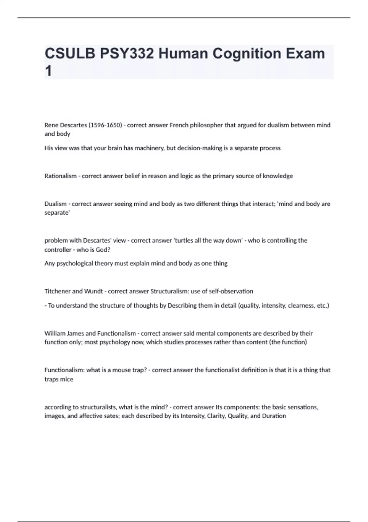 CSULB PSY332 Human Cognition Exam 1Rene Descartes () - correct answer French philosopher that argued for dualism between mind and body His view was that your brain has machinery, but decision-making is a separate process Rationalism - correct answer belief in reason and logic as the primary source of knowledge Dualism - correct answer seeing mind and body as two different things that interact; 'mind and body are separate' problem with Descartes' view - correct answer 'turtles all the way down' - who is controlling the controller - who is God? Any psychological theory must explain mind and body as one thing Titchener and Wundt - correct answer Structuralism: use of self-observation - To understand the structure of thoughts by Describing them in detail (quality, intensity, clearness, etc.) William James and Functionalism - correct answer said mental components are described by their function only; most psychology now, which studies processes rather than content (the function) Functionalism: what is a mouse trap? - correct answer the functionalist definition is that it is a thing that traps mice according to structuralists, what is the mind? - correct answer Its components: the basic sensations, images, and affective sates; each described by its Intensity, Clarity, Quality, and Duration