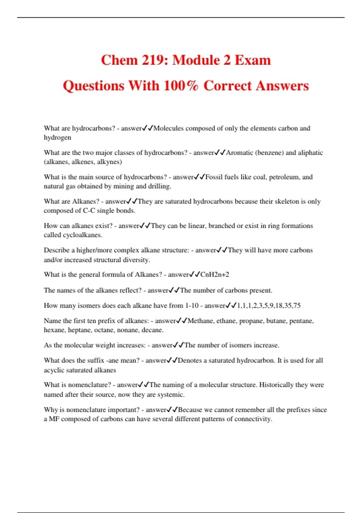 Chem 219: Module 2 Exam Questions With 100% Correct Answers What are hydrocarbons? - answerMolecules composed of only the elements carbon and hydrogen What are the two major classes of hydrocarbons? - answerAromatic (benzene) and aliphatic (alkanes, alkenes, alkynes) What is the main source of hydrocarbons? - answerFossil fuels like coal, petroleum, and natural gas obtained by mining and drilling. What are Alkanes? - answerThey are saturated hydrocarbons because their skeleton is only composed of C-C single bonds. How can alkanes exist? - answerThey can be linear, branched or exist in ring formations called cycloalkanes. Describe a higher/more complex alkane structure: - answerThey will have more carbons and/or increased structural diversity. What is the general formula of Alkanes? - answerCnH2n+2 The names of the alkanes reflect? - answerThe number of carbons present. How many isomers does each alkane have from 1-10 - answer1,1,1,2,3,5,9,18,35,75 Name the first ten prefix of alkanes: - answerMethane, ethane, propane, butane, pentane, hexane, heptane, octane, nonane, decane. As the molecular weight increases: - answerThe number of isomers increase. What does the suffix -ane mean? - answerDenotes a saturated hydrocarbon. It is used for all acyclic saturated alkanes What is nomenclature? - answerThe naming of a molecular structure. Historically they were named after their source, now they are systemic. Why is nomenclature important? - answerBecause we cannot remember all the prefixes since a MF composed of carbons can have several different patterns of connectivity. What is it meant by the systemic approach? - answerThere are now methods of naming molecules so that they all have unique names. You can then determine the structure from only the name and vice-versa. IUPAC rules for naming branced alkanes: - answer1. Find the parent name by identifying the longest continuous chain of carbons. 2. Number the parent chain. (begin at the end of the chain nearest to the first branch.) 3. If there are two equally long continuous chains, select the one with most branches. 4. If the first branch point is the same distance, choose the one that gives the lowest substituents. 5. If the substituents are both equidistant then choose the numbering so the substituent goes with the higher alphabetic priority. How are linear alkanes named? - answerBy combining the prefix indicating the number to the suffix -ane. What is a substituent? - answerAny group attached to the parent chain. What are alkyl groups? - answerSaturated hydrocarbon substituents. You drop the -yl for - ane. A one carbon substituent is a methyl group, four carbon is butyl. What is a locant? - answerA number used to determine the suffix. Describes the position of substituents. What happens when two or more of the same type of substituents are present on the parent chain? Like 3 methyl groups - answerAdditional prefixes including the number are added. How would you describe finding 2,3 dimethylpentane? - answerIt is a 5 carbon chain, then it has substituents on numbers 2, 3 and those are methyl groups. How are IUPAC systematic names put together? - answerLocant-(prefix) substituentparent If two or more different substituents are present on the parent chain then what happens? - answerThey are listed alphabetically. Ethyl before methyl How are halogen atoms as substituents named? - answerChange the -ine to -o, chlorine=chloro, bromine=bromo. propyl or n-propyl - answerCH3CH2CH2 isopropyl - answerCH3CHCH3 What does the squiggle bond mean? - answerPoint of attachment to the parent chain.