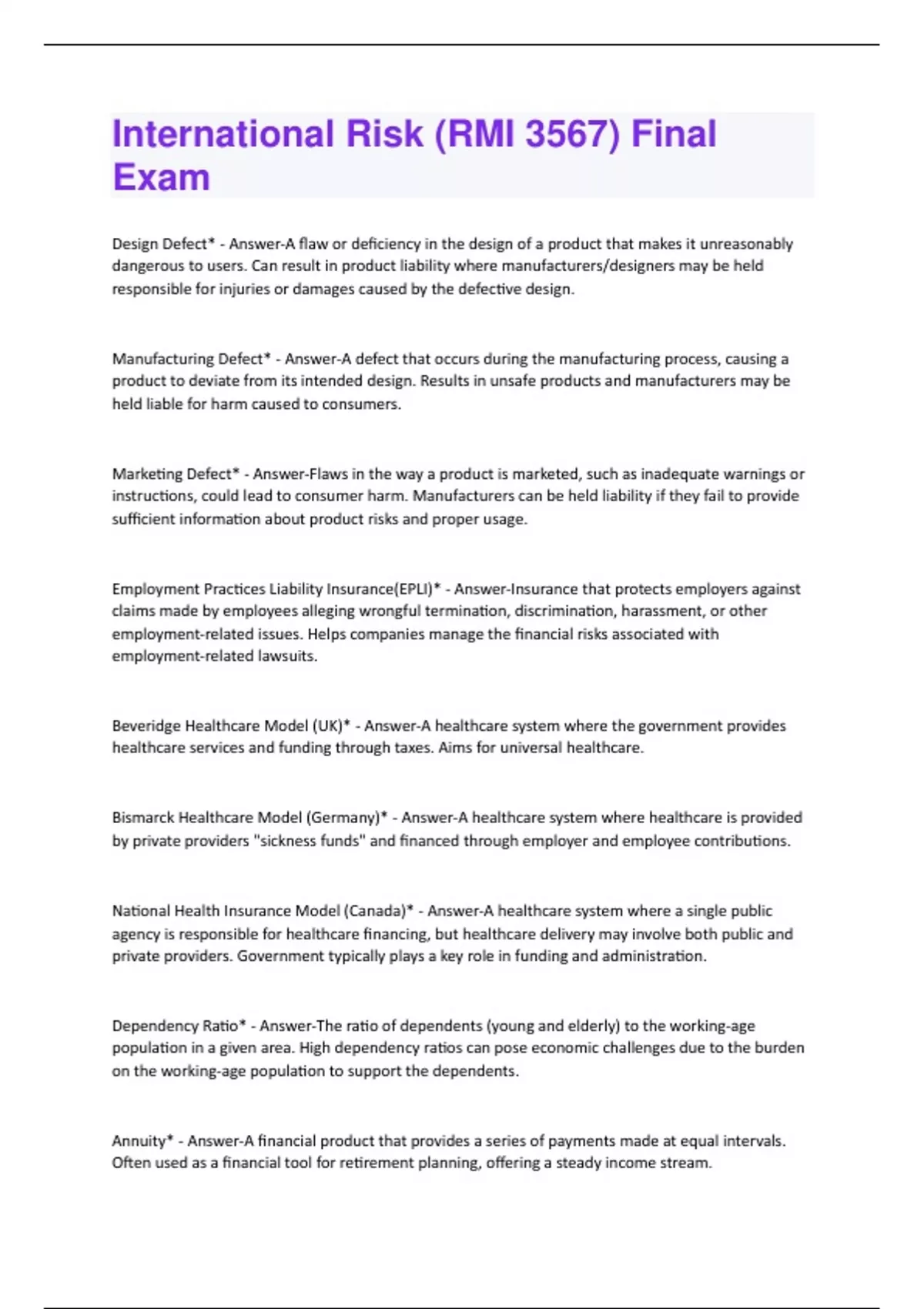 Design Defect* - Answer-A flaw or deficiency in the design of a product that makes it unreasonably dangerous to users. Can result in product liability where manufacturers/designers may be held responsible for injuries or damages caused by the defective design. Manufacturing Defect* - Answer-A defect that occurs during the manufacturing process, causing a product to deviate from its intended design. Results in unsafe products and manufacturers may be held liable for harm caused to consumers. Marketing Defect* - Answer-Flaws in the way a product is marketed, such as inadequate warnings or instructions, could lead to consumer harm. Manufacturers can be held liability if they fail to provide sufficient information about product risks and proper usage. Employment Practices Liability Insurance(EPLI)* - Answer-Insurance that protects employers against claims made by employees alleging wrongful termination, discrimination, harassment, or other employment-related issues. Helps companies manage the financial risks associated with employment-related lawsuits. Beveridge Healthcare Model (UK)* - Answer-A healthcare system where the government provides healthcare services and funding through taxes. Aims for universal healthcare. Bismarck Healthcare Model (Germany)* - Answer-A healthcare system where healthcare is provided by private providers "sickness funds" and financed through employer and employee contributions. National Health Insurance Model (Canada)* - Answer-A healthcare system where a single public agency is responsible for healthcare financing, but healthcare delivery may involve both public and private providers. Government typically plays a key role in funding and administration. Dependency Ratio* - Answer-The ratio of dependents (young and elderly) to the working-age population in a given area. High dependency ratios can pose economic challenges due to the burden on the working-age population to support the dependents. Annuity* - Answer-A financial product that provides a series of payments made at equal intervals. Often used as a financial tool for retirement planning, offering a steady income stream.Reverse Mortgage* - Answer-A financial product that allows homeowners to convert a portion of their home equity into cash, typically done by seniors. It lets homeowners stay in their homes while receiving streams of payments. In exchange, the lender will eventually own the home. Microinsurance* - Answer-Insurance products designed to provide coverage to low-income individuals and families. Aims to make insurance more accessible to those in developing countries. African Risk Capacity* - Answer-A specialized agency of the African Union that provides insurance coverage to African countries against the impact of extreme weather events and natural disasters. Basis Risk* - Answer-The risk that the value of a financial instrument used for hedging will not move in perfect correlation with the asset being hedged. ex. Parametric payout falls short of covering actual damages caused. Parametric(Index) Insurance* - Answer-Insurance that pays out a predetermined amount based on the occurrence of a specific event, often tied to measurable parameters (wind speed or seismic movement) Group Lending* - Answer-A lending approach where small loans are provided to a group of individuals who are collectively responsible for repayment. Counterparty Risk* - Answer-The risk that the other party in a financial transaction may default on their obligations. Takaful* - Answer-Islamic insurance that operates on the principles of mutual assistance and cooperation. Members contribute "donations" to a pool system to guarantee each other. Sharia outlaws interest, gambling, and uncertainty. Translates to "mutual guarantee." Islamic bonds - no investments in questionable industries.