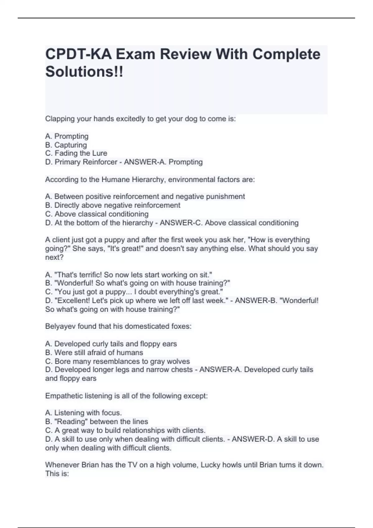 According to the Humane Hierarchy, environmental factors are: A. Between positive reinforcement and negative punishment B. Directly above negative reinforcement C. Above classical conditioning D. At the bottom of the hierarchy - ANSWER-C. Above classical conditioning A client just got a puppy and after the first week you ask her, "How is everything going?" She says, "It's great!" and doesn't say anything else. What should you say next? A. "That's terrific! So now lets start working on sit." B. "Wonderful! So what's going on with house training?" C. "You just got a puppy... I doubt everything's great." D. "Excellent! Let's pick up where we left off last week." - ANSWER-B. "Wonderful! So what's going on with house training?" Belyayev found that his domesticated foxes: A. Developed curly tails and floppy ears B. Were still afraid of humans C. Bore many resemblances to gray wolves D. Developed longer legs and narrow chests - ANSWER-A. Developed curly tails and floppy ears Empathetic listening is all of the following except: A. Listening with focus. B. "Reading" between the lines C. A great way to build relationships with clients. D. A skill to use only when dealing with difficult clients. - ANSWER-D. A skill to use only when dealing with difficult clients. Whenever Brian has the TV on a high volume, Lucky howls until Brian turns it down. This is:
